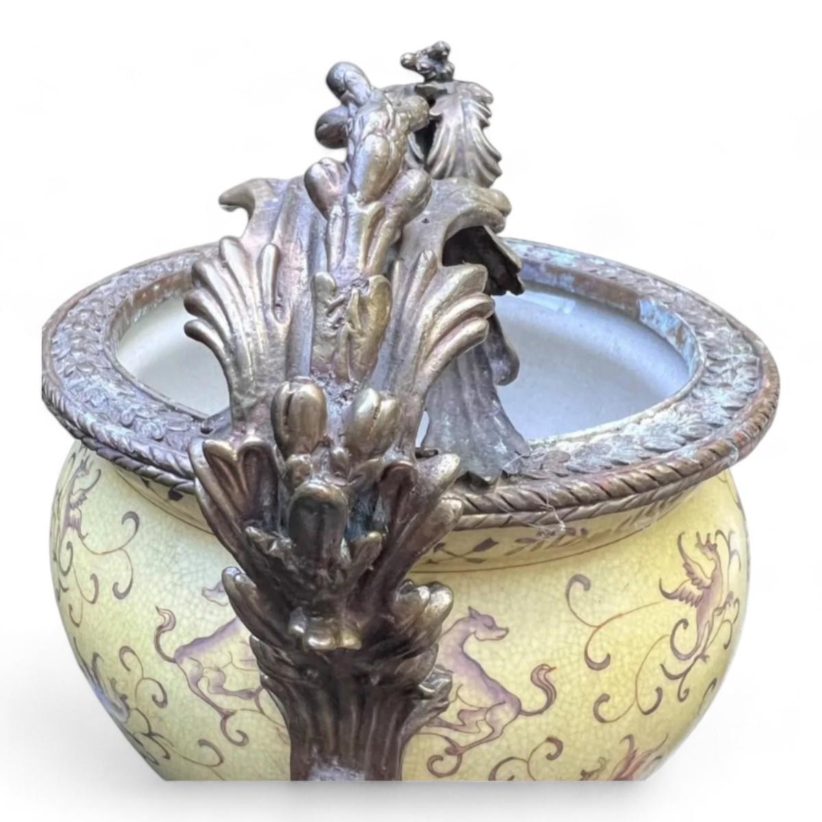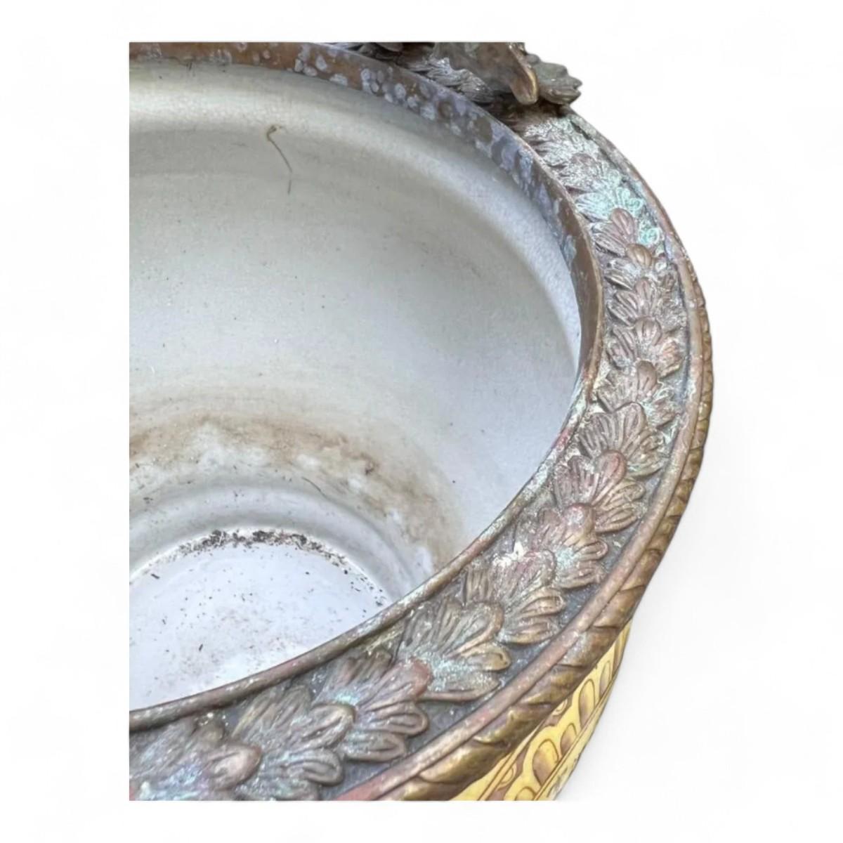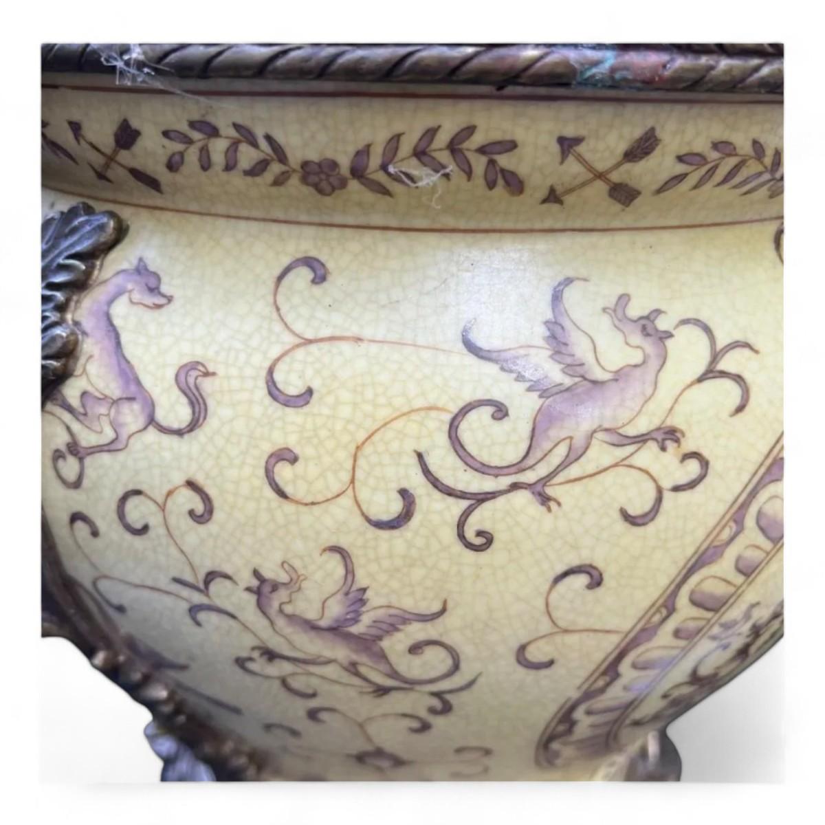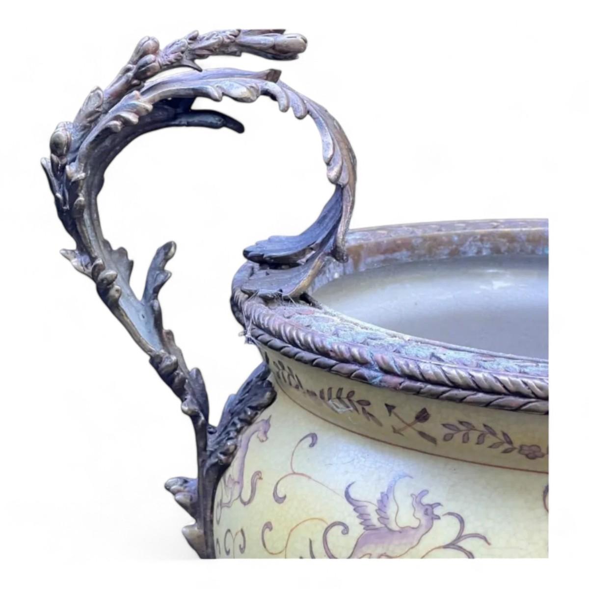 Vintage Chinese Hand Painted Signed Porcelain And Bronze Ormulu Cache Pot Jardiniere