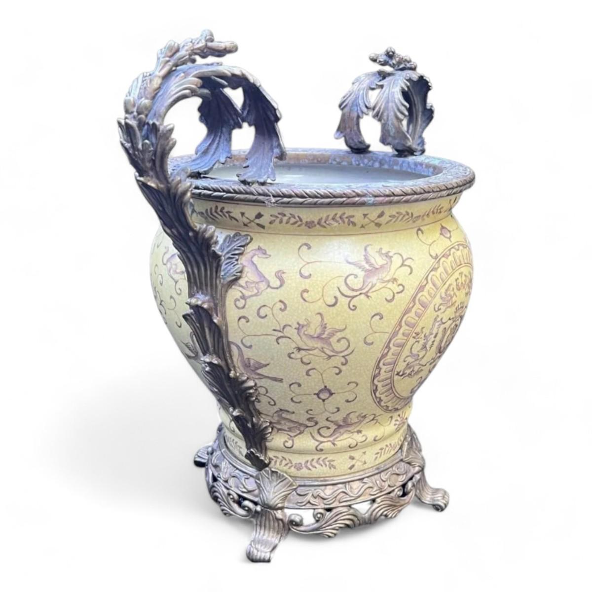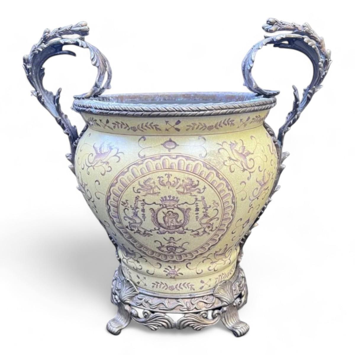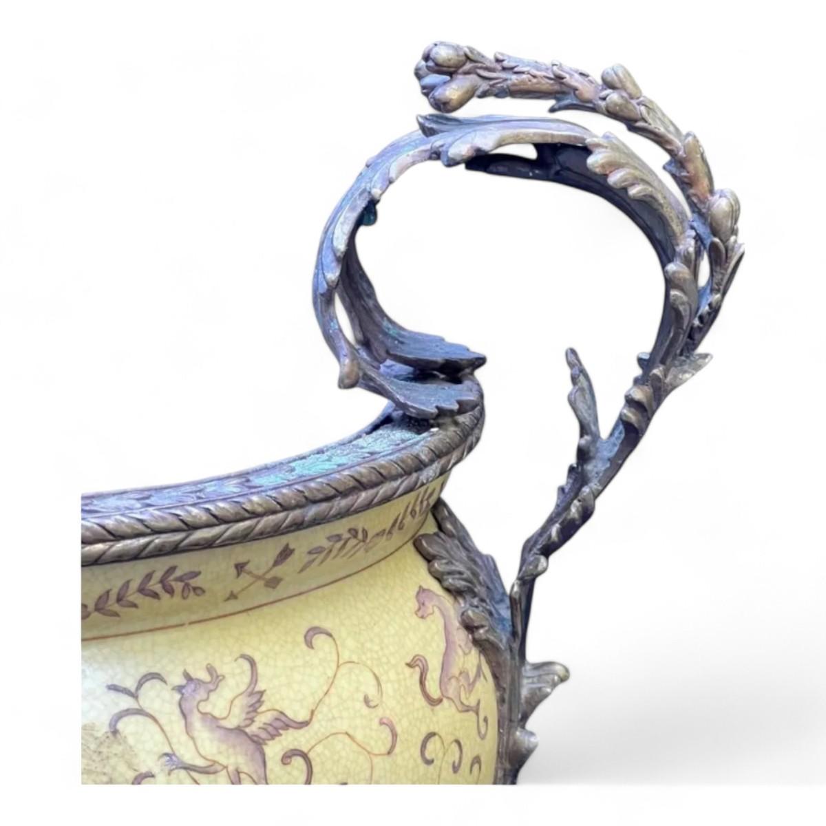 Vintage Chinese Hand Painted Signed Porcelain And Bronze Ormulu Cache Pot Jardiniere