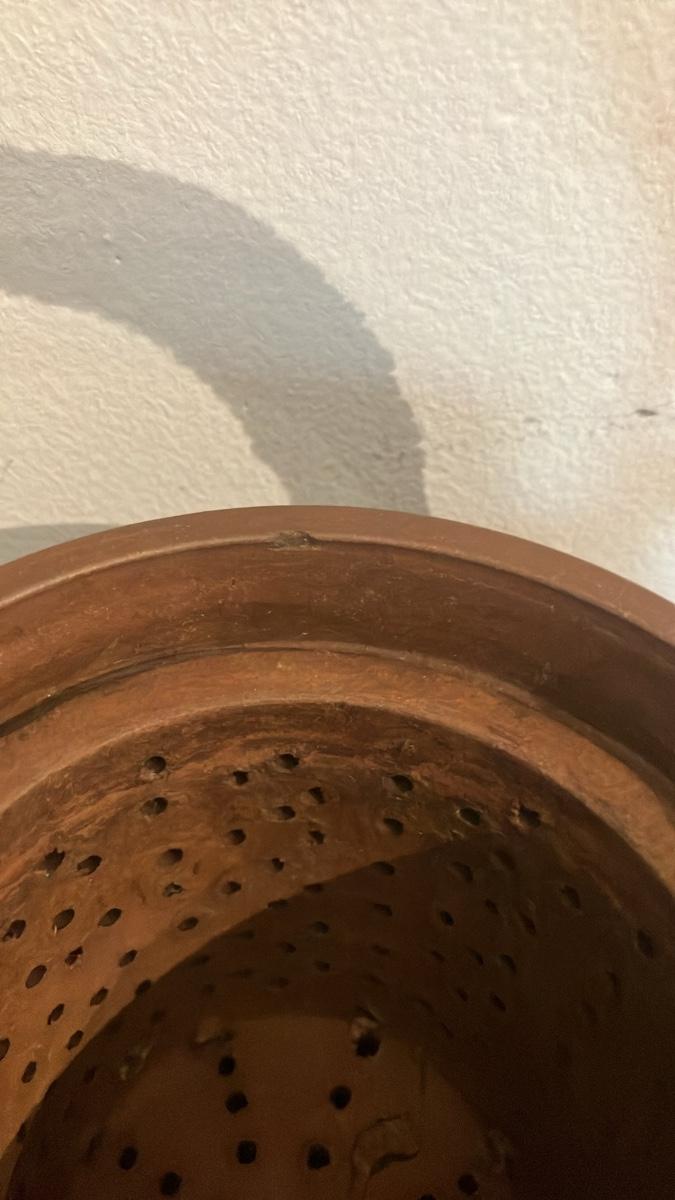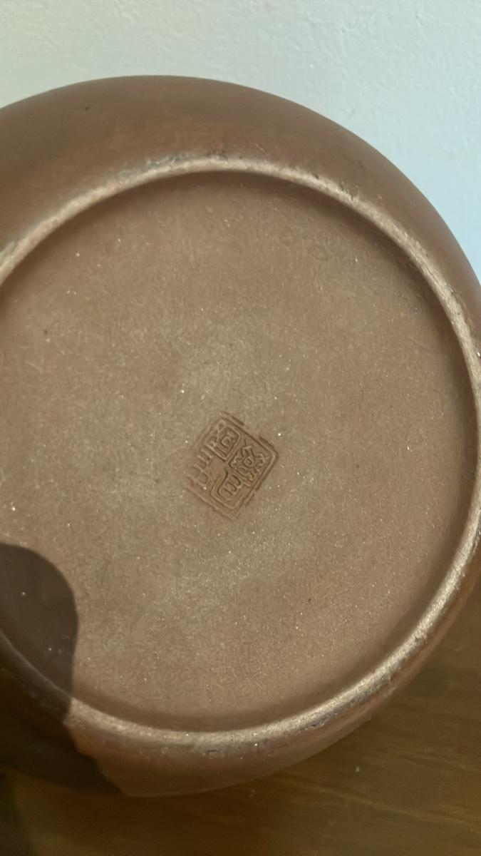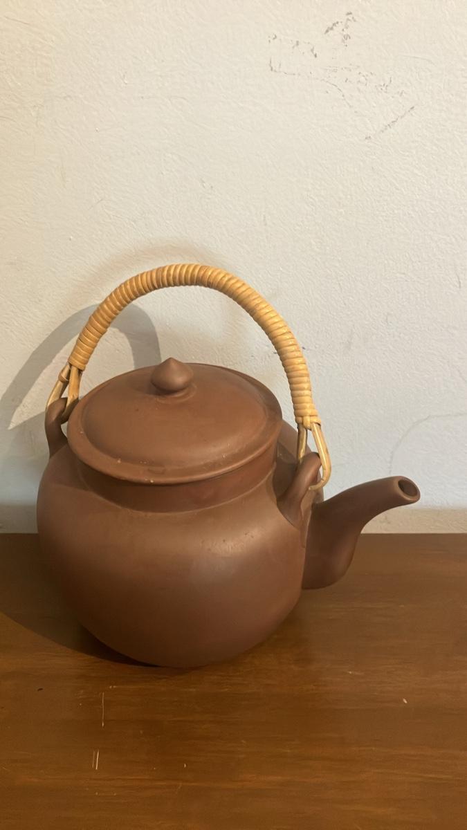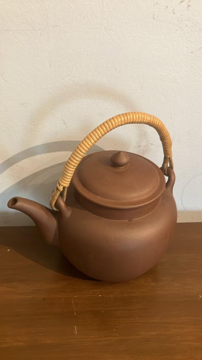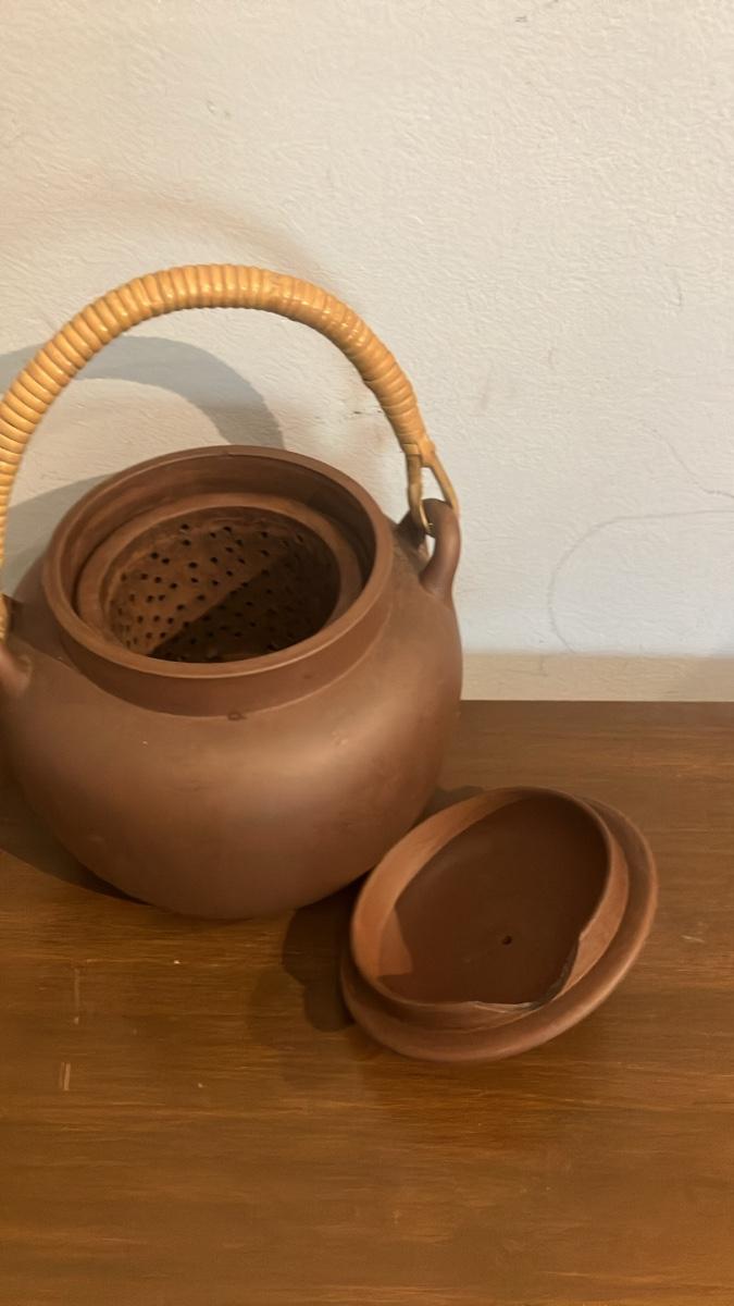 Vintage Chinese Yixing Clay Teapot, Lid, Strainer, Bamboo Handle 6.5”h