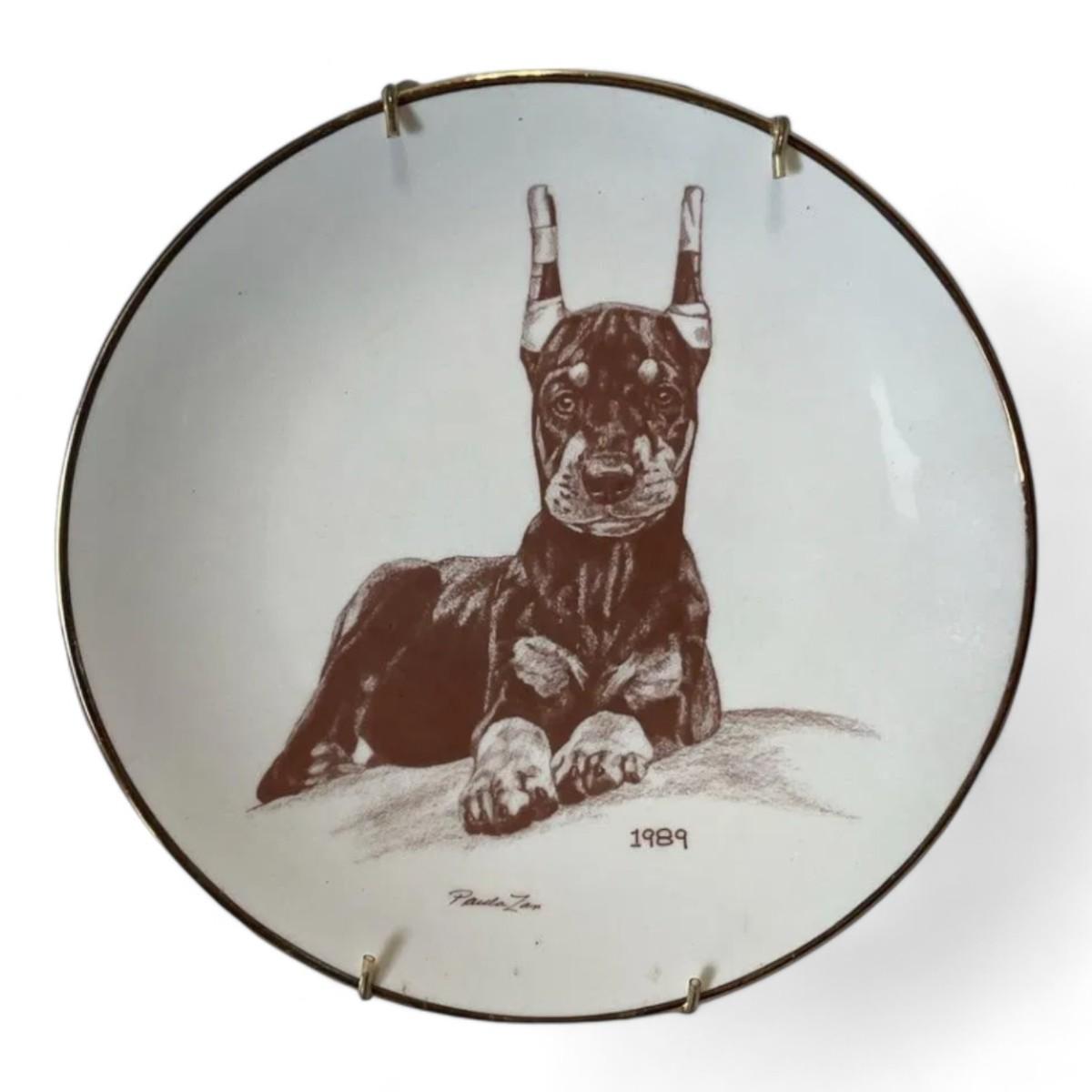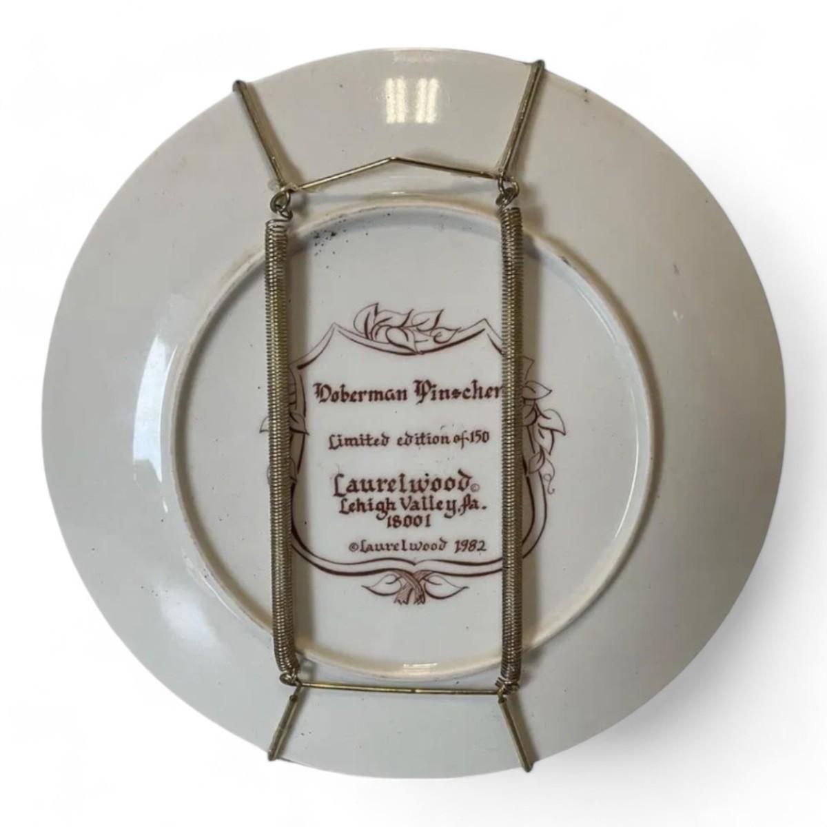This vintage circa 1989 Doberman Pinscher collectible is a striking and rare piece from the Laurelwood Lehigh Valley collection limited to just 150 editions. Featuring a detailed portrayal of a Doberman Pinscher this item captures the breeds strong elegant stance and attentive expression highlighting the Dobermans characteristic blend of power intelligence and grace. The artwork is meticulously crafted to showcase the dogs sleek coat muscular build and sharp features with rich realistic colors.