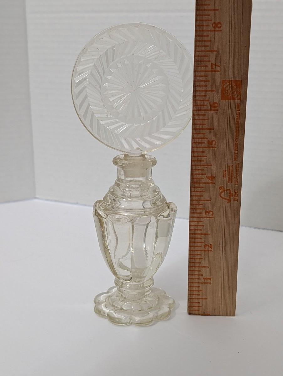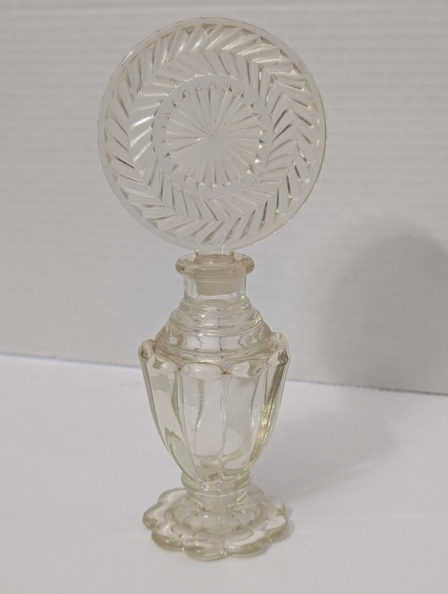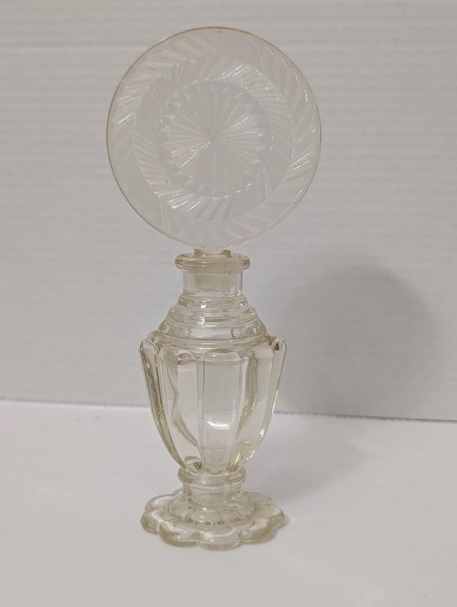 Vintage Clear Pressed Glass Perfume Bottle with Round Etched Disc Stopper and Paneled Stem Base