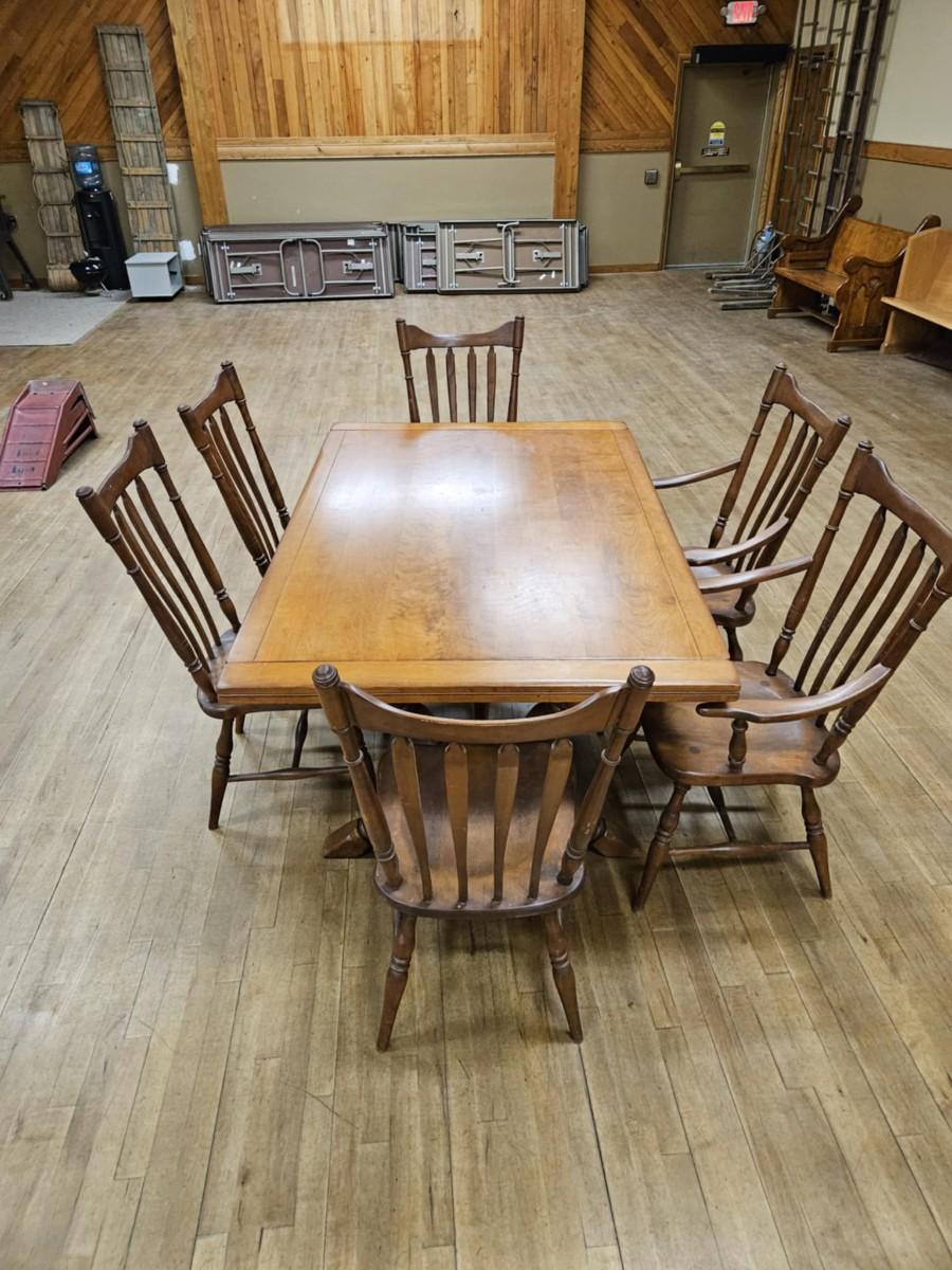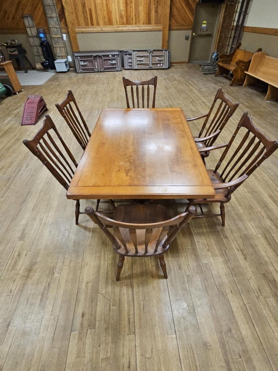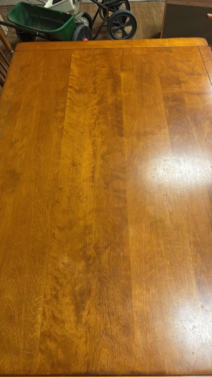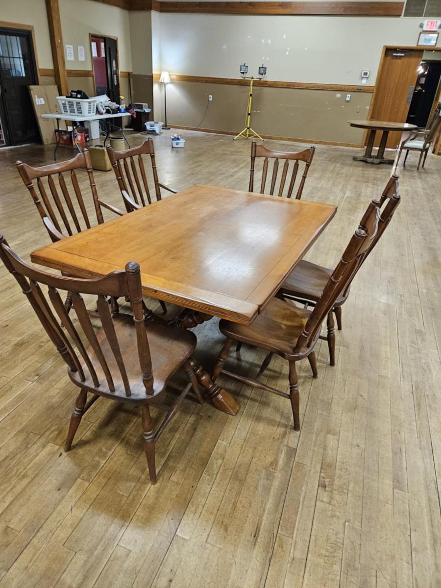 Seats 4-6 comfortably and includes two table sleeves (note: the grain doesn’t match perfectly). One chair has a crack, but it’s still functional.