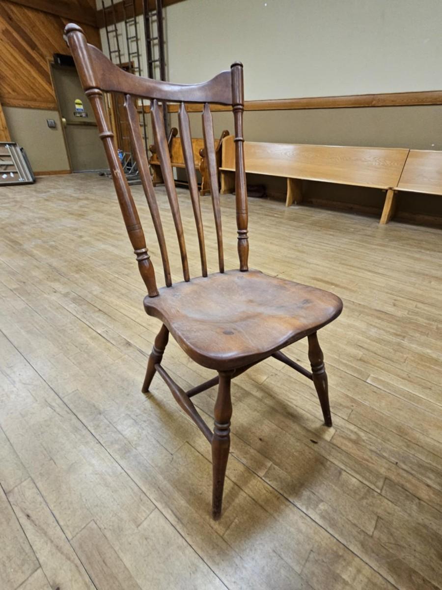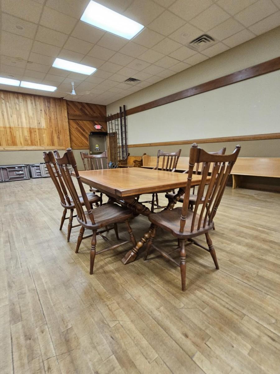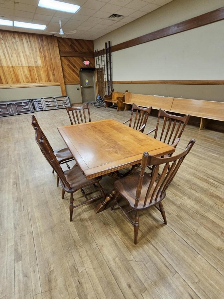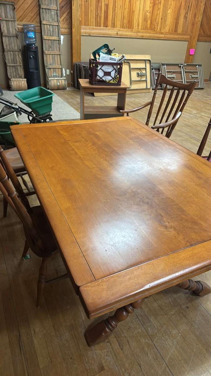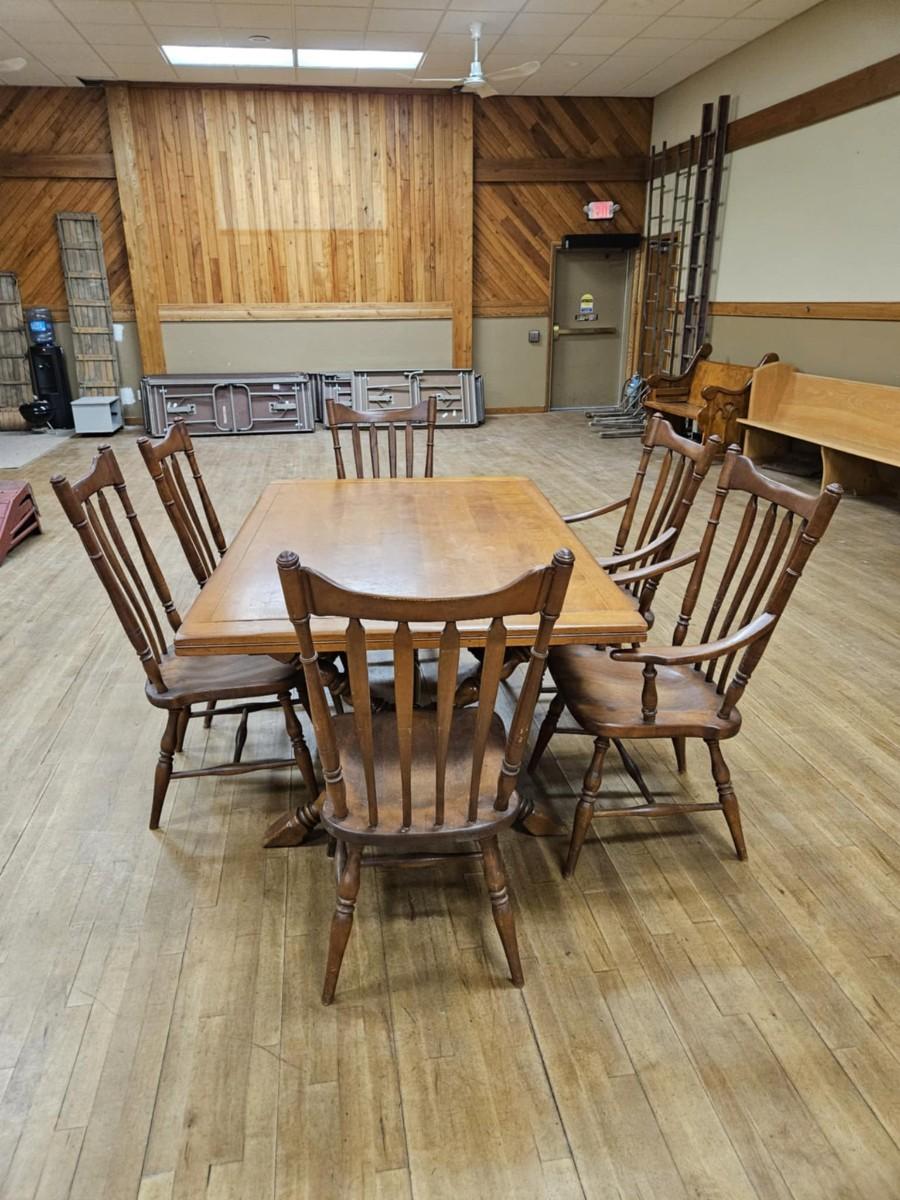 Seats 4-6 comfortably and includes two table sleeves (note: the grain doesn’t match perfectly). One chair has a crack, but it’s still functional.