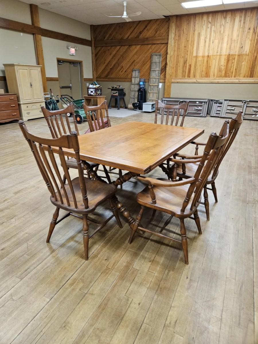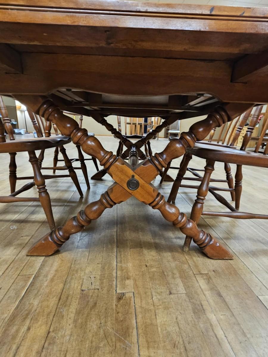 This gorgeous vintage Cushman Colonial Creations solid maple sawbuck table with a trestle base is a timeless classic! Its warm maple finish and sturdy craftsmanship make it perfect for family meals or as a statement piece in your home.