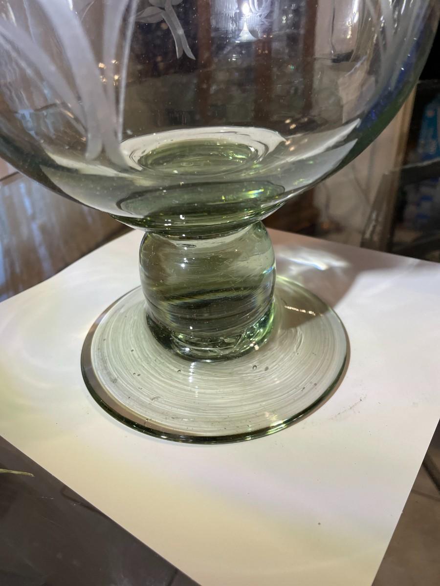 Vintage Exquisite Large Engraved Etched Glass Hand Blown Trifle Footed Bowl or Candle Holder 12.25" Tall in VG Preowned Condition.