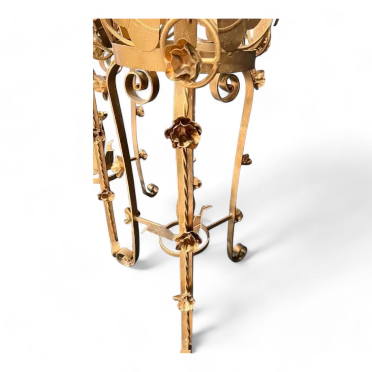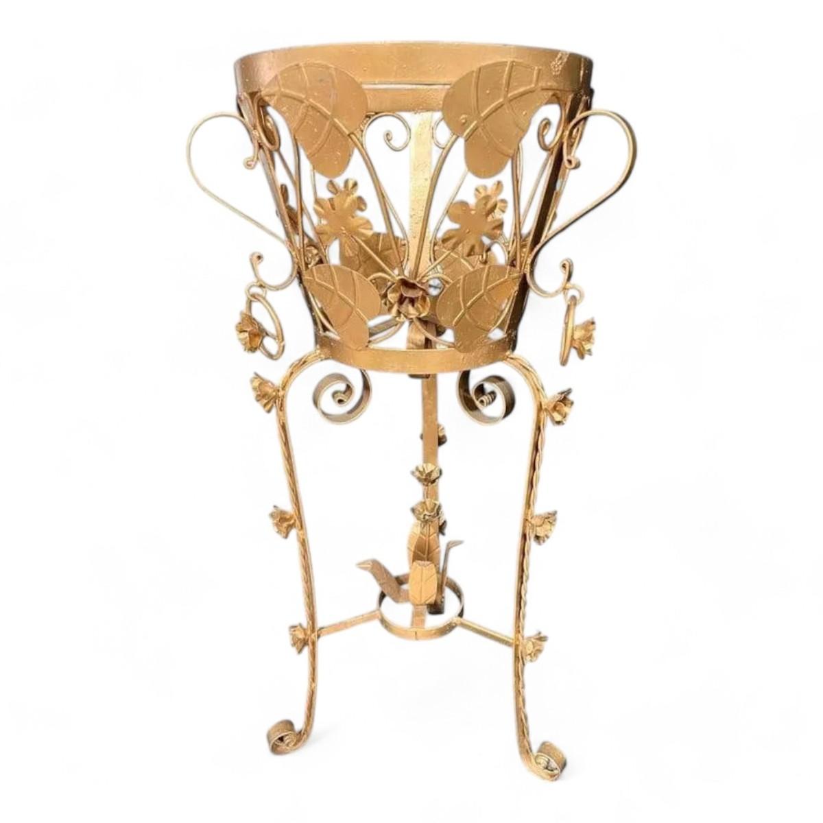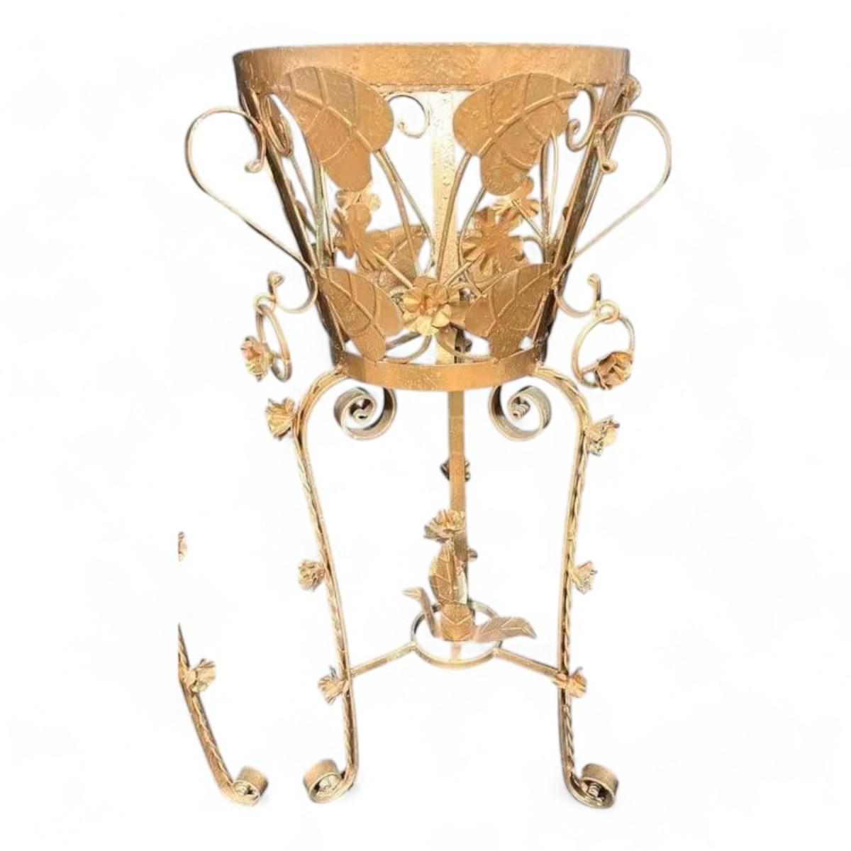 The stand is designed to elevate your favorite flowers or plants allowing them to be showcased beautifully. Its sturdy construction ensures stability and durability while the artistic design brings a touch of vintage charm to your garden patio or indoor space. The combination of wrought iron and tole details highlights the craftsmanship of the period making this piece a unique and eye-catching addition to any decor. Perfect for garden enthusiasts and collectors of vintage French art this planter pot flower stand adds a touch of timeless beauty and sophistication to your home.