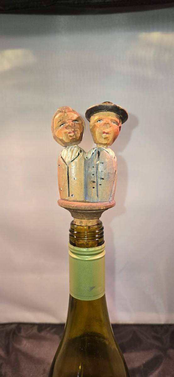 Wooden hand carved bottle stopper, picturing a happy couple.
