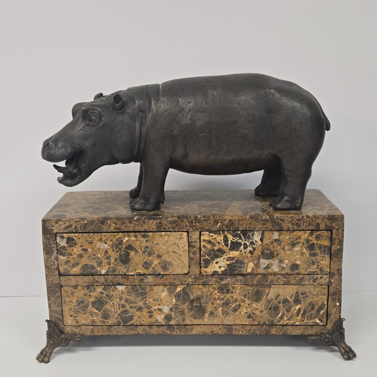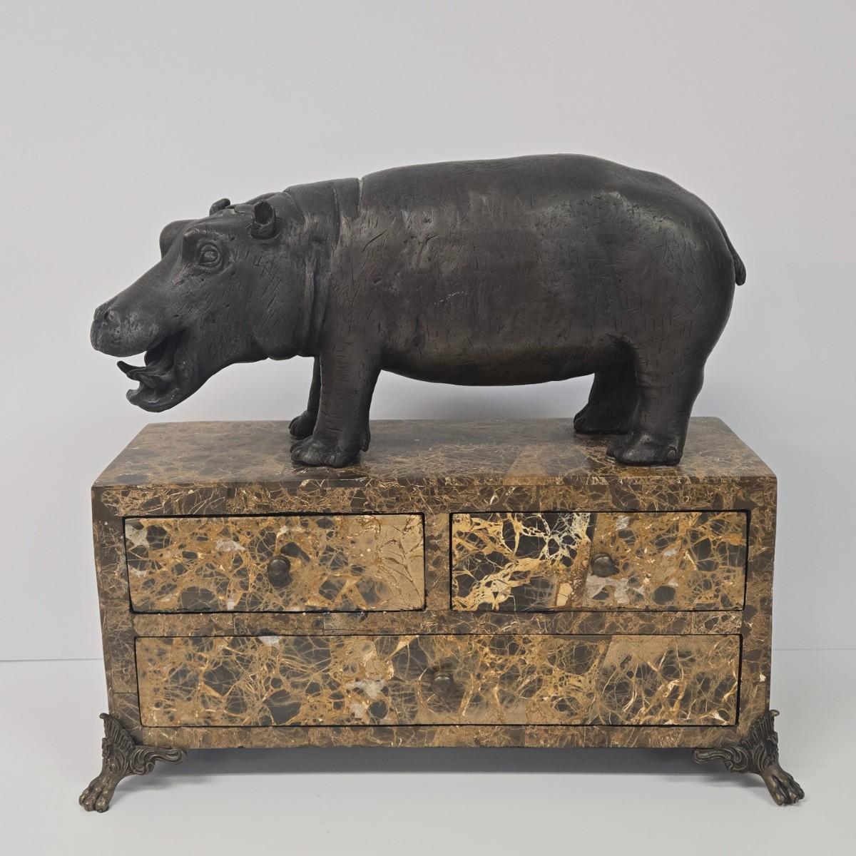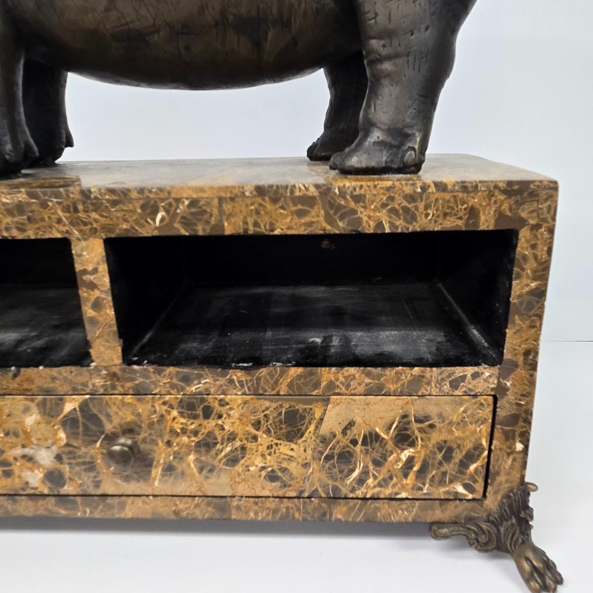 RARE Vintage Maitland-Smith Bronze Hippopotamus Atop a Faux Marble Footed Jewelry Box / 12x12