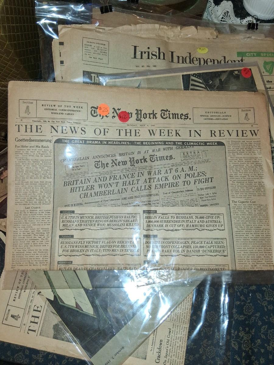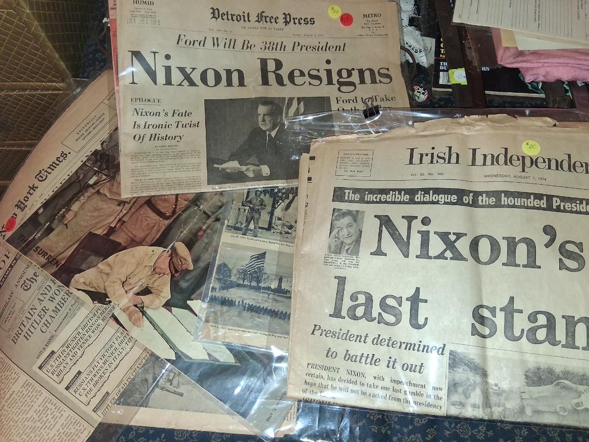 These Newspapers are from WWII through Nixon Resignation. All in sleeves. All in decent condition. Includes New York Times, Detroit Free Press & more