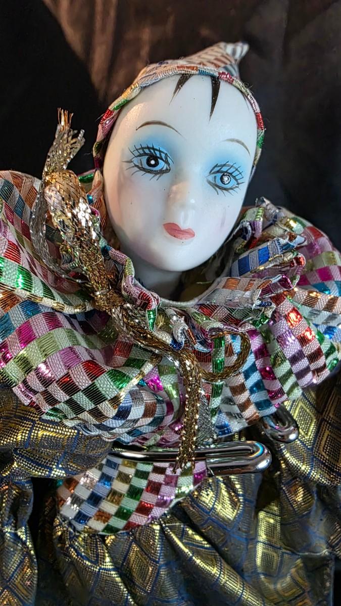 The doll’s porcelain face is delicately hand-painted — soft blush cheeks, expressive blue eyes, and fine lashes that capture the timeless allure of Venetian-style masquerade performers. Its glimmering attire and graceful pose reflect a blend of artistry and nostalgia, reminiscent of the classic commedia dell’arte tradition.