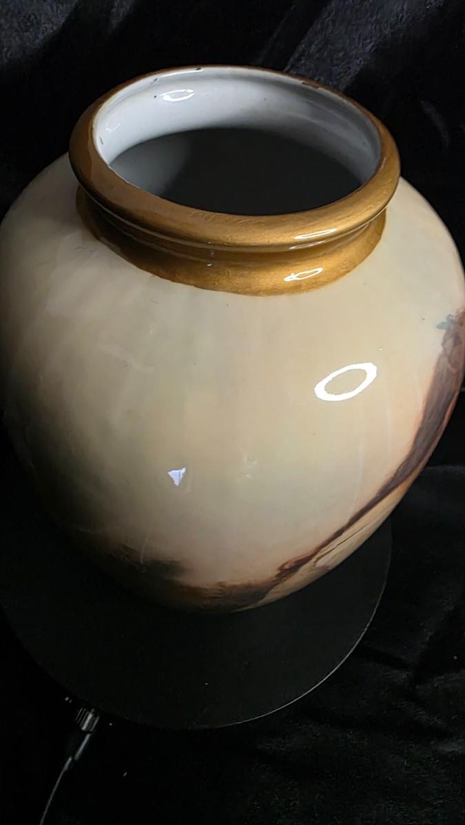 A gold-trimmed rim crowns the vase, lending a subtle touch of elegance to its classical silhouette. Standing approximately 11 inches tall, this collectible piece speaks to House of Lloyd’s distinctive approach to emotional design — merging European art motifs with the nostalgia of Americana craftsmanship.
