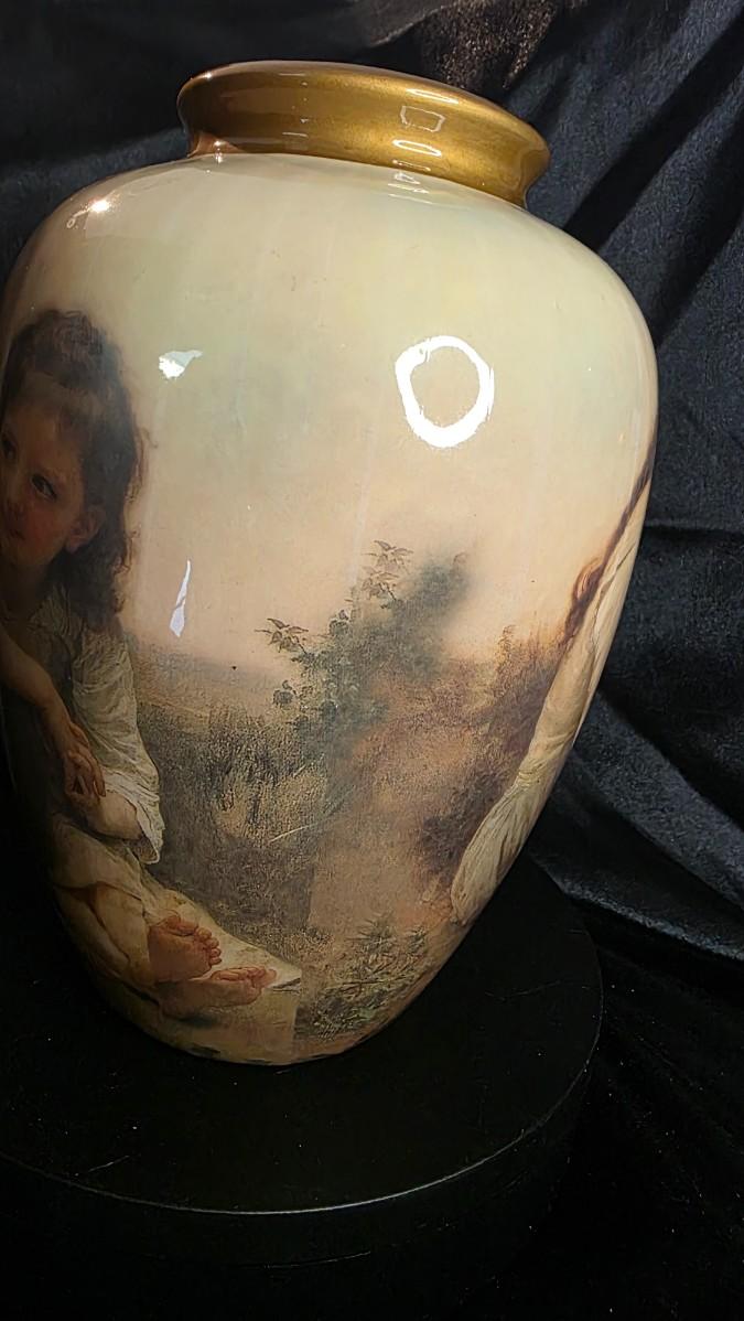 Crafted in the late 1980s to early 1990s, the vase features a detailed transfer image of two young girls — one gently playing a wooden flute while the other listens, her eyes bright with affection and wonder. Their innocence is framed against a soft countryside backdrop, rendered in warm earth tones beneath a gentle glaze that glows beneath the light.