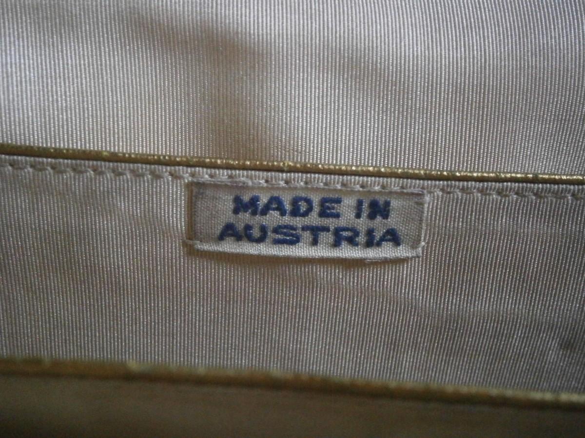 Vintage Tapestry Ladies Purse made in Austria from the Early 1900's, 6 x 5 in. (excluding chain strap), front of frame is enamel on brass with seed pearls (missing some of the pearls), silk lined with original mirror and cloth change purse, also has original owners calling card.