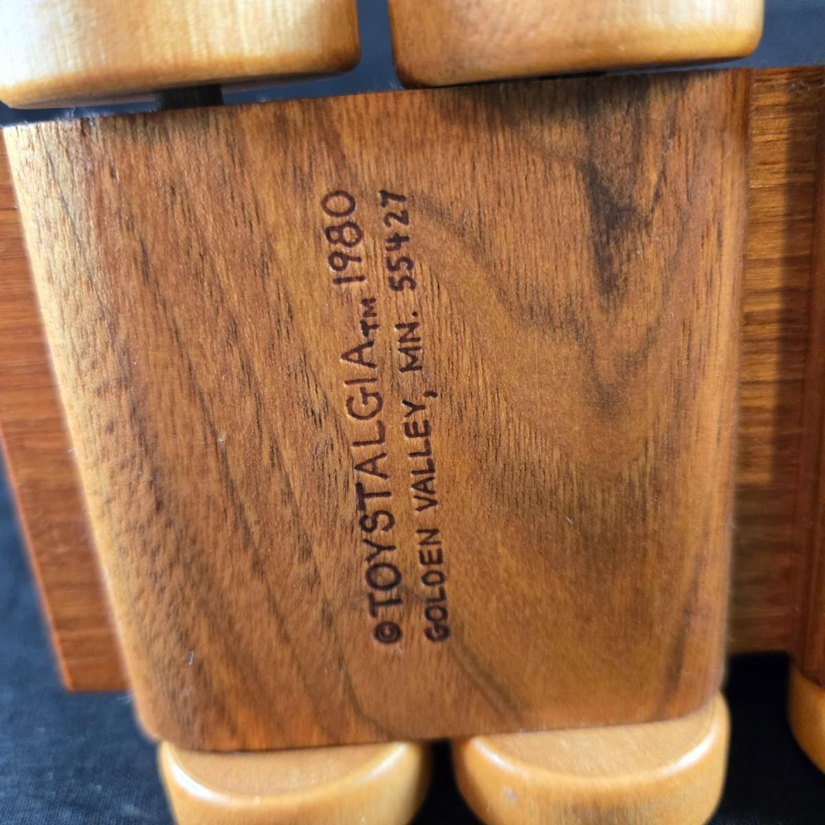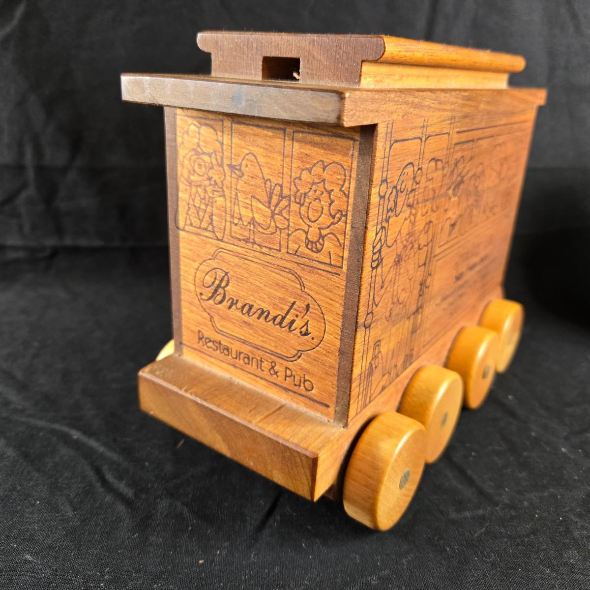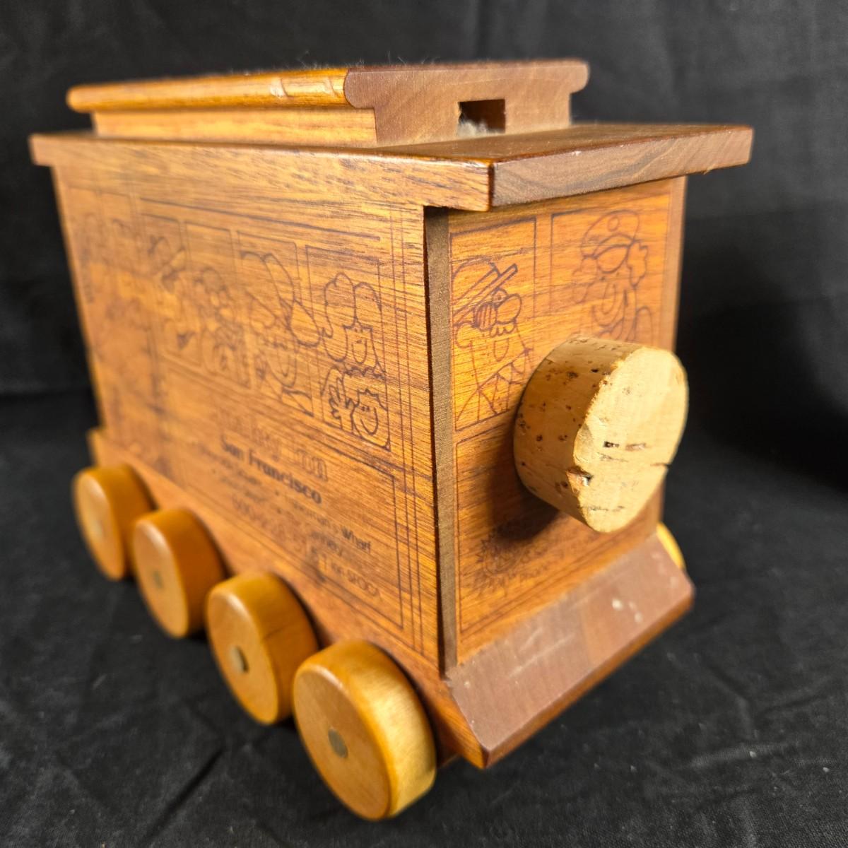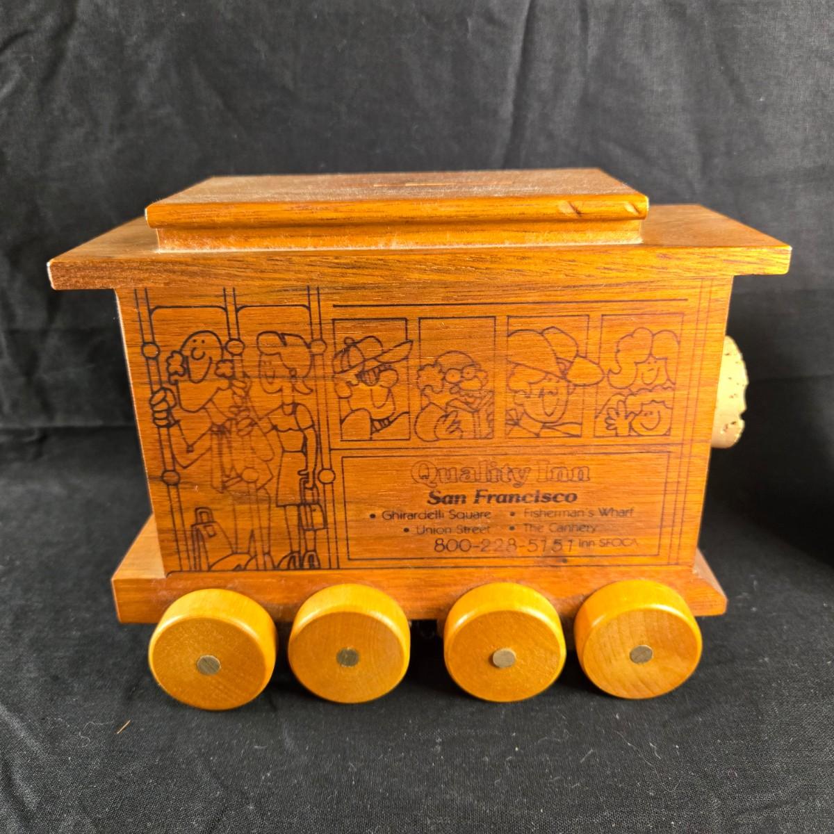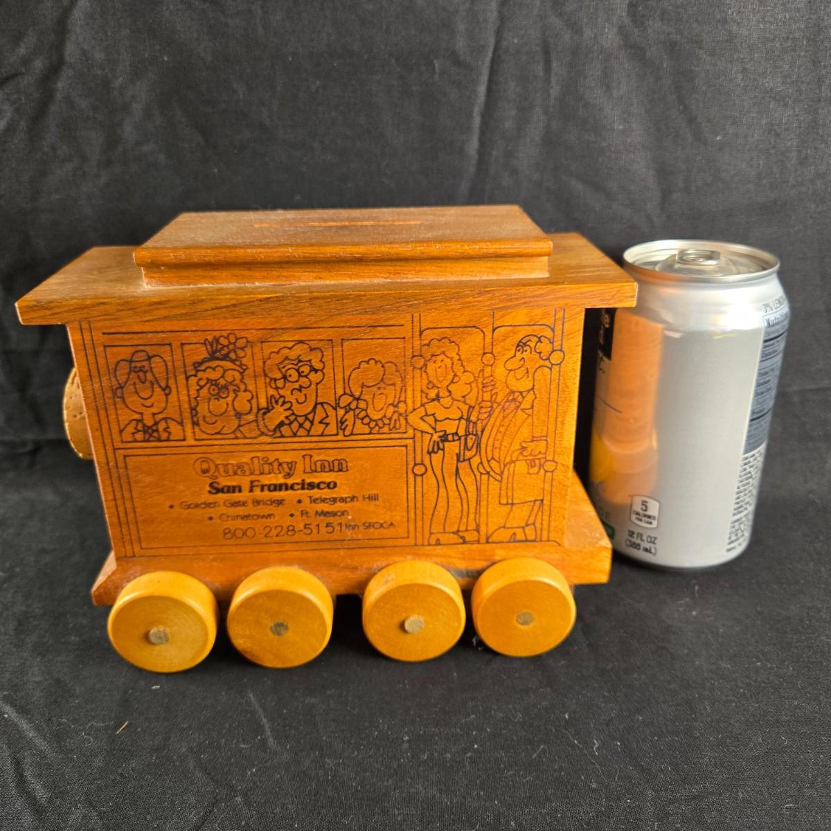 Vintage Wooden Trolley Bank. This nicely made wooden trolley bank was a souvenir from the Quality Inn, San Francisco. The trolley was made by Toystalgia in 1980. It is large enough to hold a substantial amount of coins. It is approximately 7-inches long by 6-inches tall.