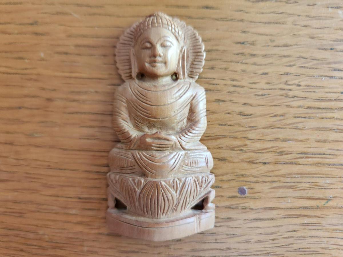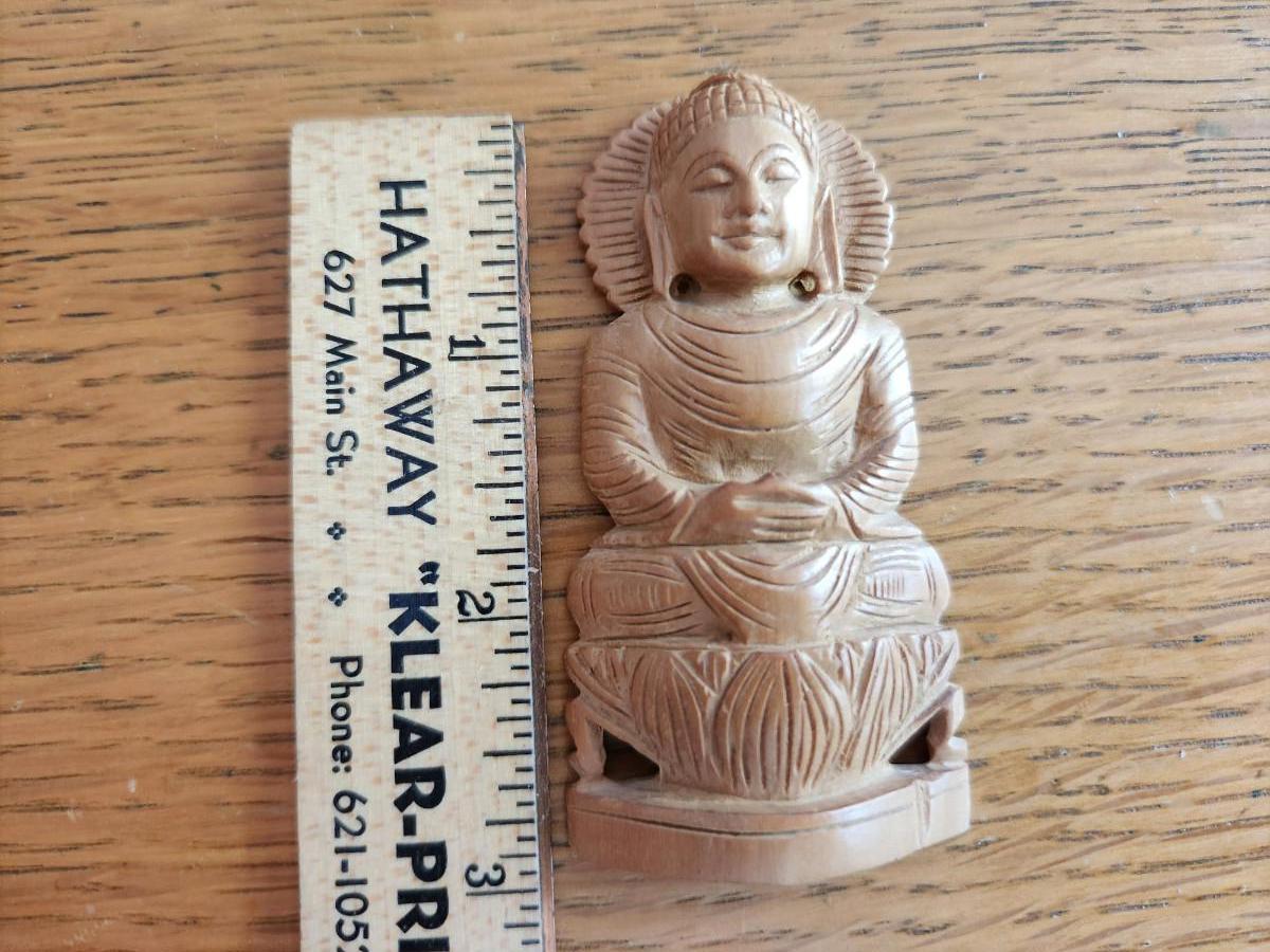 This auction lot is for a Wood Buddha Statuette. This small item was most probably a tourist prize, something small to have to remember a beloved trip to Southeast Asia or Indonesia. Wonderful souvenir or collector's item. Measures about 3-inches by 1.5-inches.