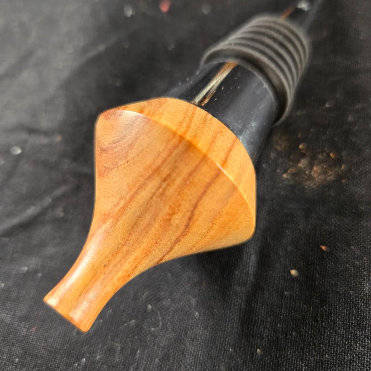 This auction lot is for a grouping of Wooden Party Items. The offering includes 8 Handmade vintage appetizer picks in a signed pick holder and a beautiful turned top wine stopper. Both appear unused.