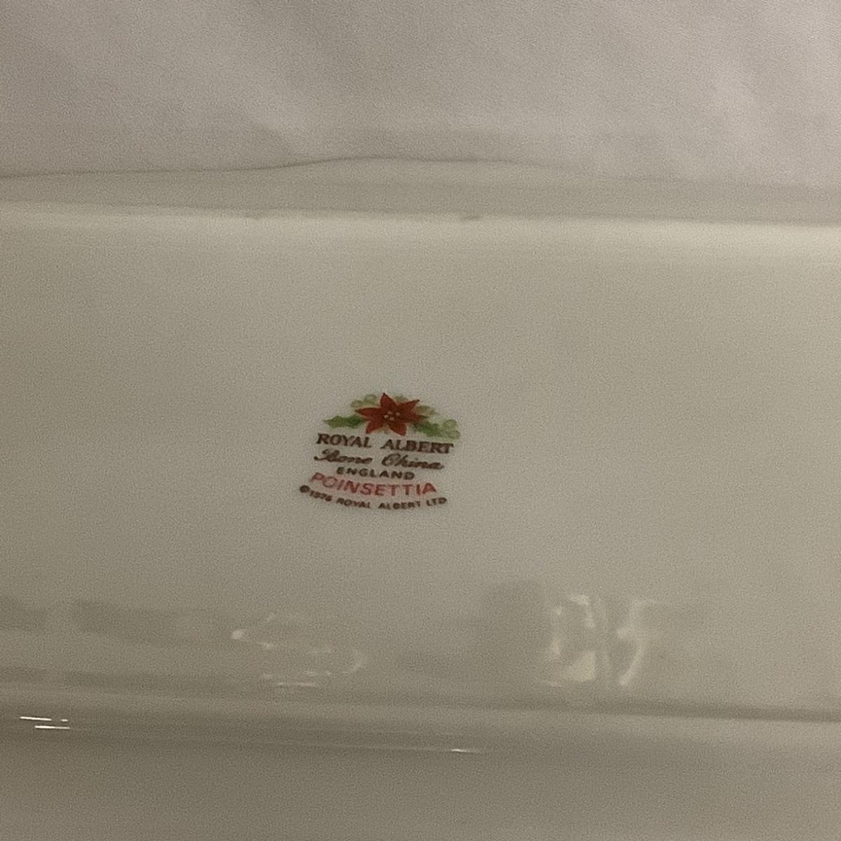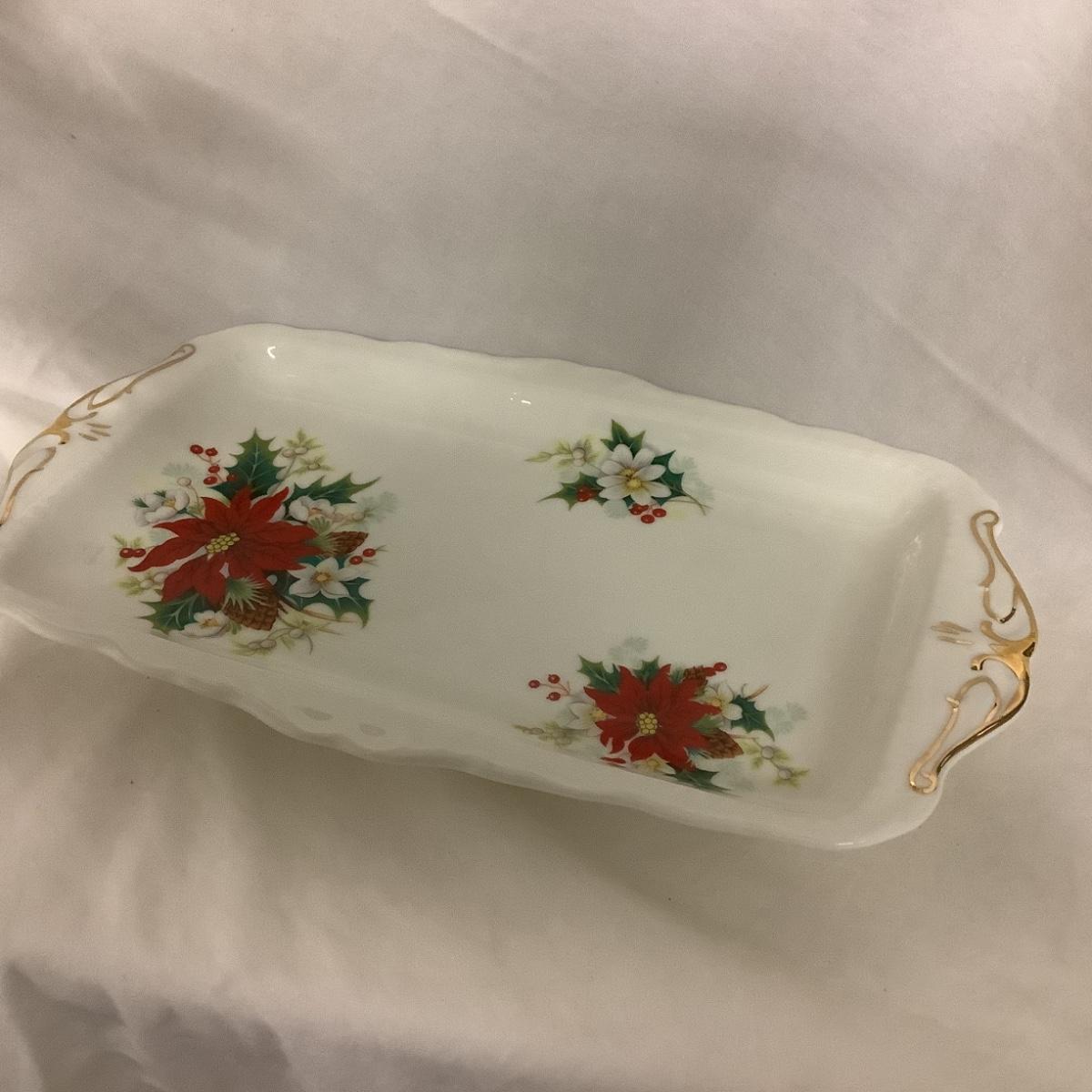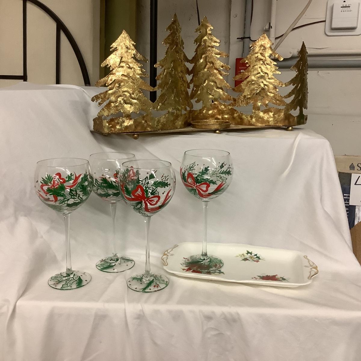 Set of 4 Handpainted Christmas wine goblets , Royal Albert Poinsettia Plate and Gold Tree candle holder