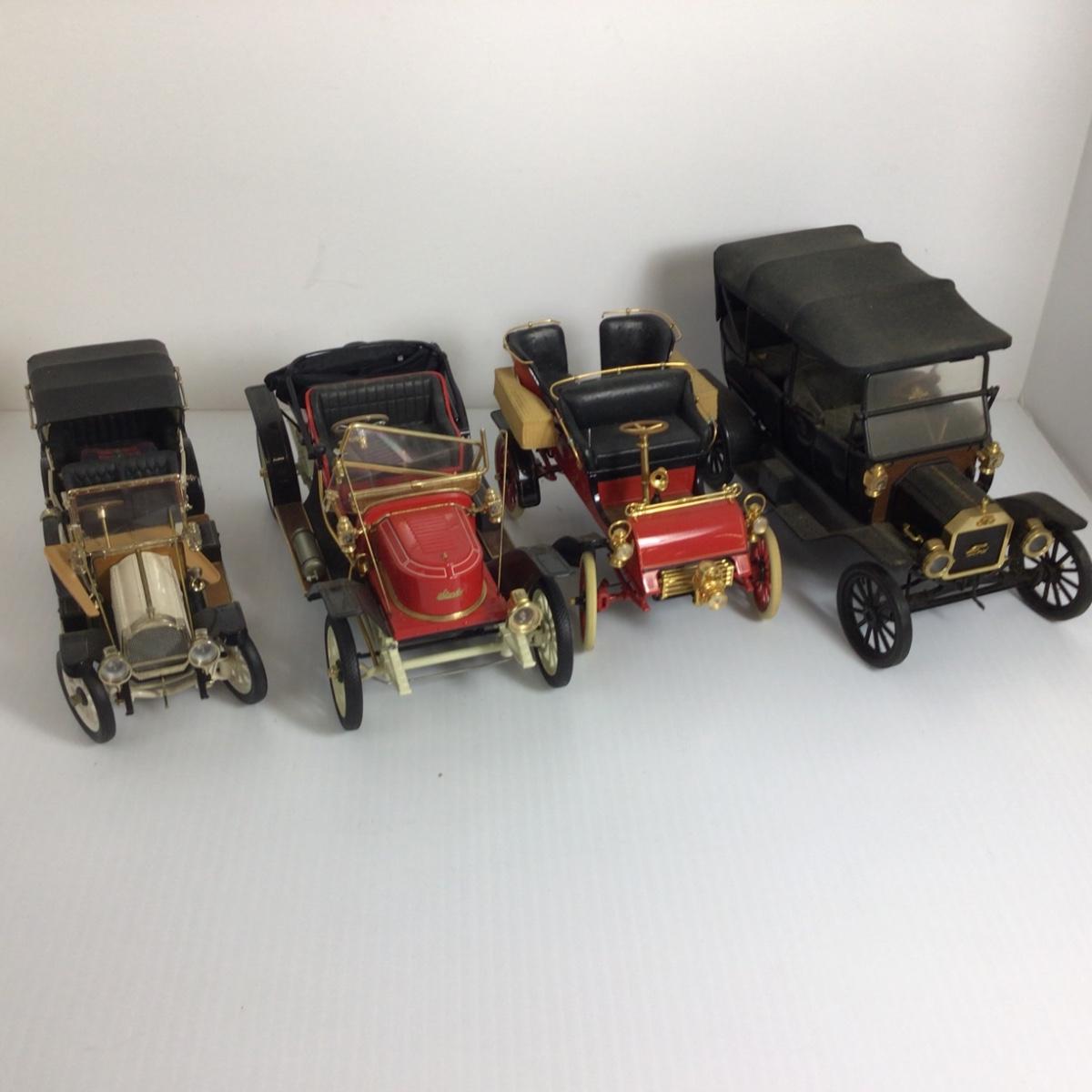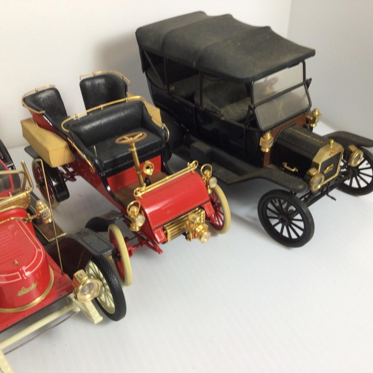 There are 4 assorted Ford/Steamer cars from the Franklin Mint, cars are being sold as is as found, pieces may be missing or broken.