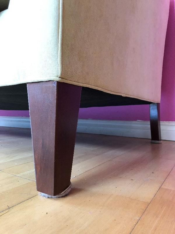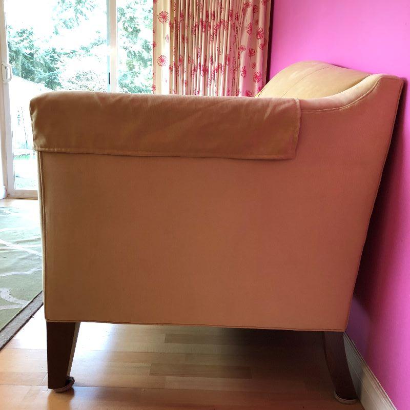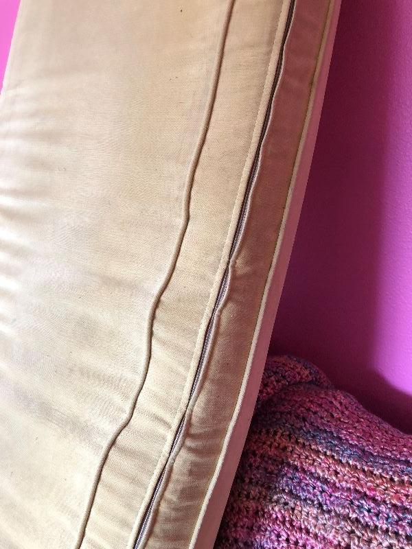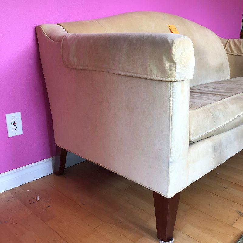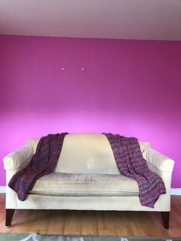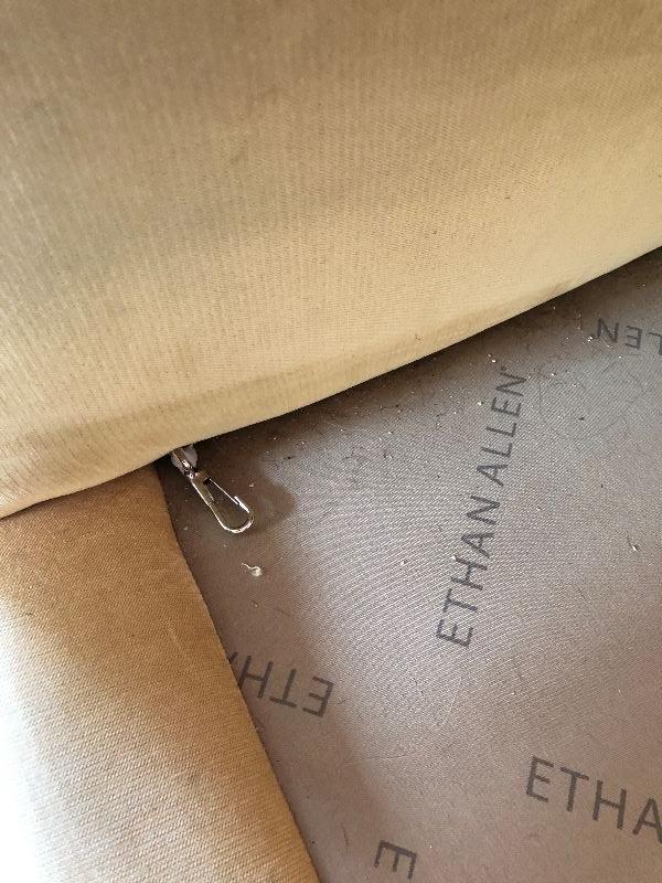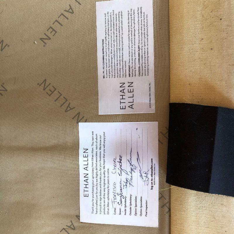 Ethan Allen Couch. This hand crafted American made couch may look rough but it has great bones, and is ready for a little TLC to bring it back to its original glory 74"L x 34"L x 38.5"H. Cushion is reversible and removeable. Afghans are not included.