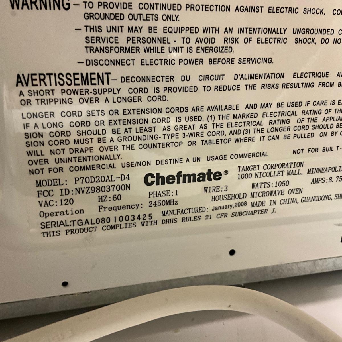 003 Chef Mate Microwave