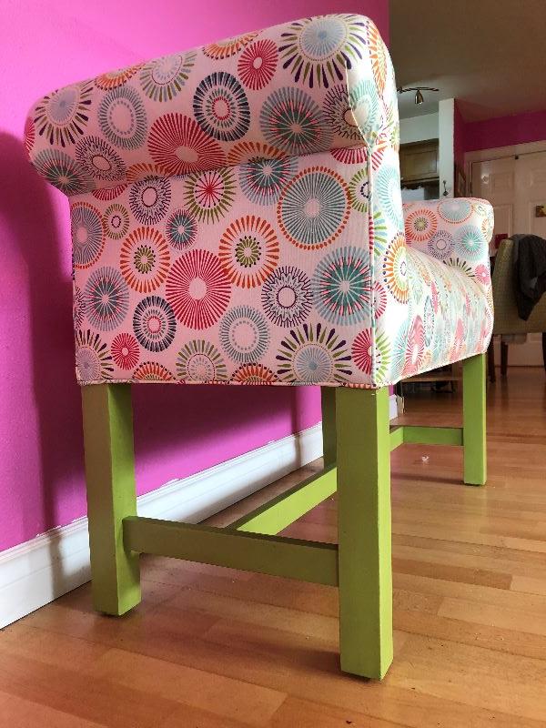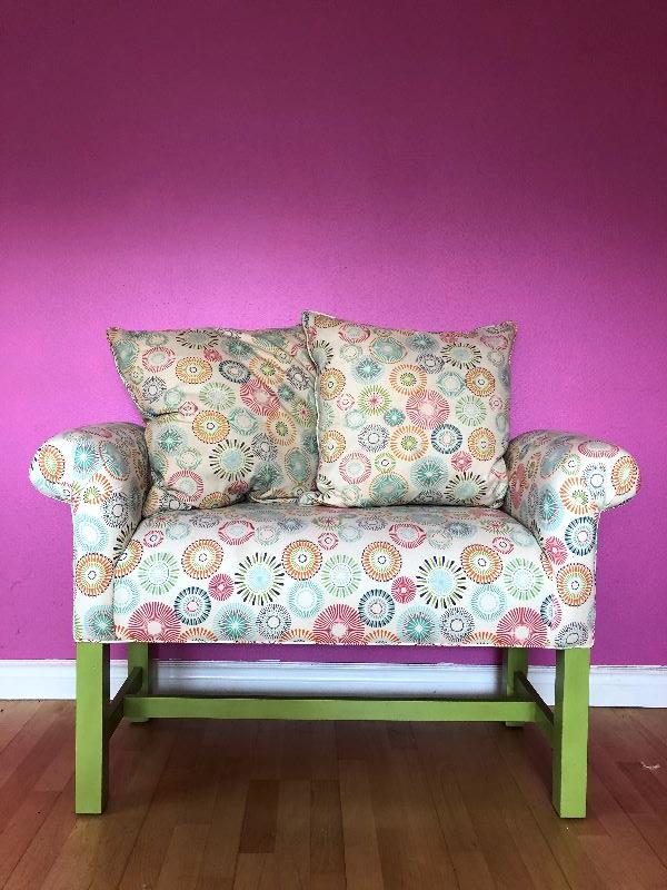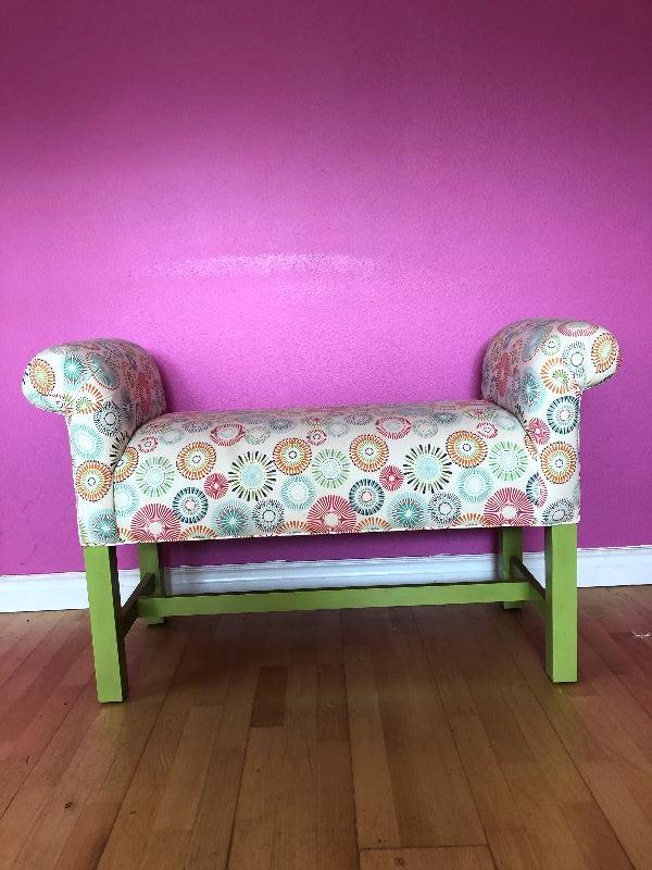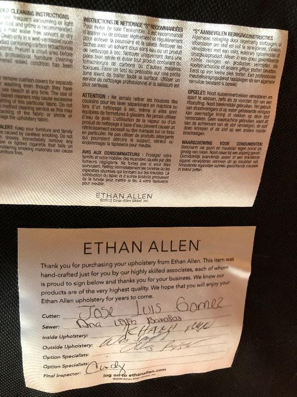 A real conversation piece for your home. Ethan Allen Sitting Stool with matching pillows hand crafted in the United States. 44"L x 18.5"D x 29" Arm Height, and 22" Seat Height.
