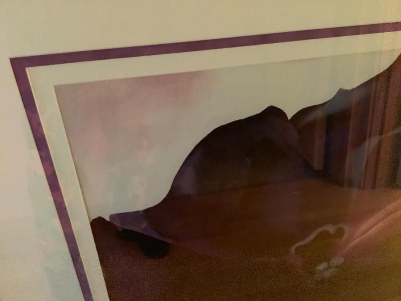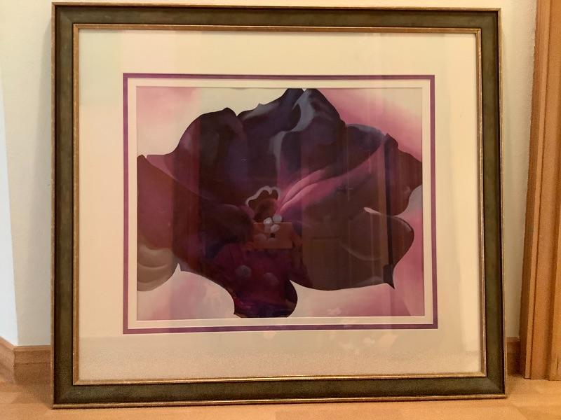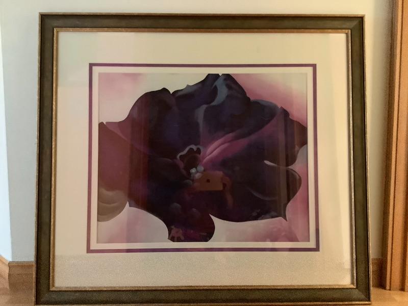 Giclee Print of Georgia O’Keeffe “Purple Petunia” framed and matted with glass 45” x 39”. Some small damage shows on the frame