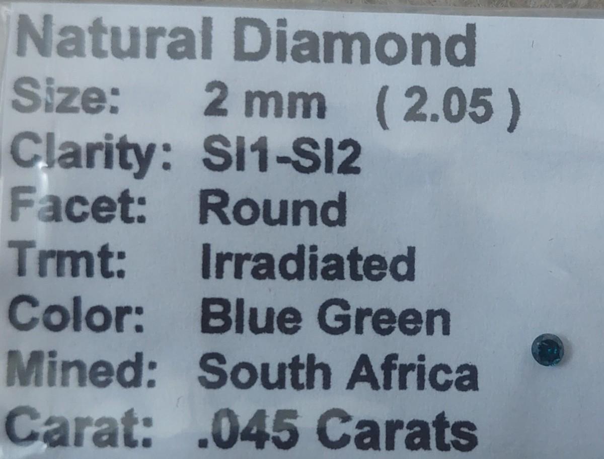 0.045 carat irradiated blue-green diamond