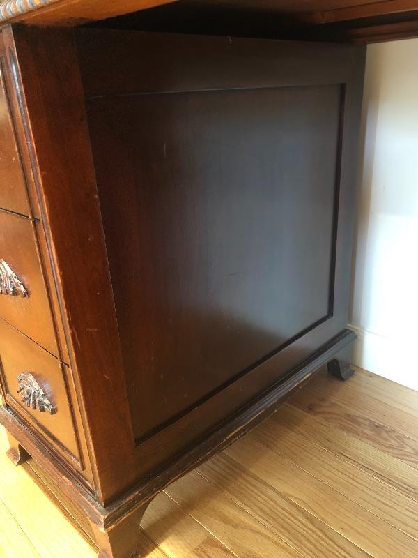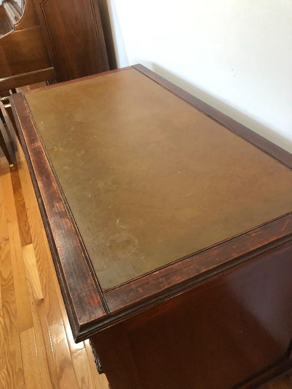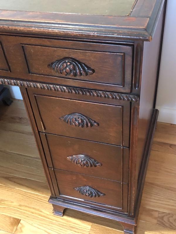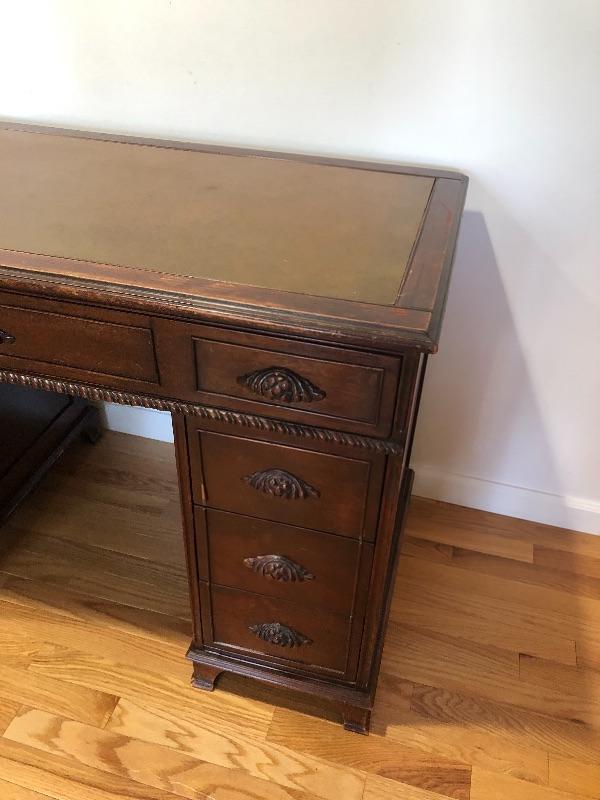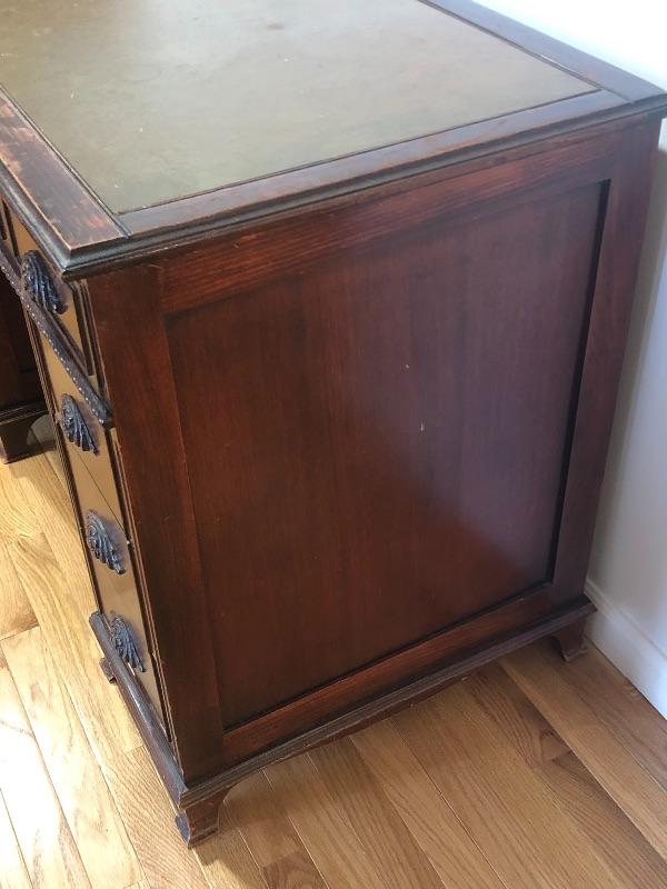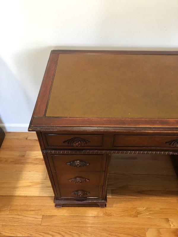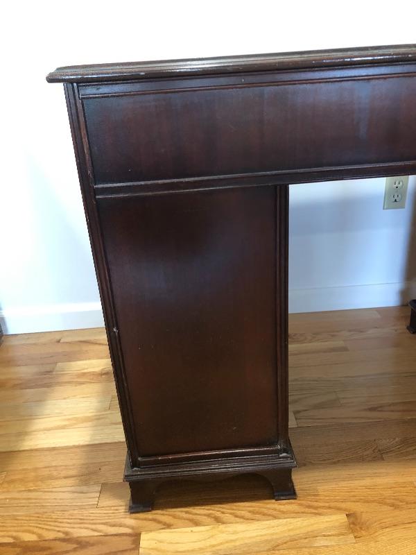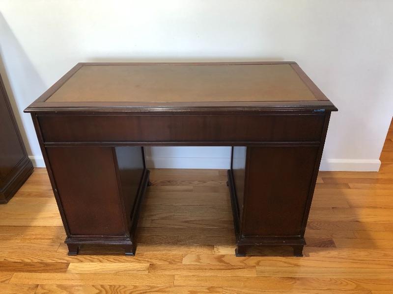 43.5 W x 30 Tall x 23 D, This desk has a leather top with solid wood body. Dove tail drawers. Leather has some wear but gives the desk character. Small scratches on body. Manufacturer not found.