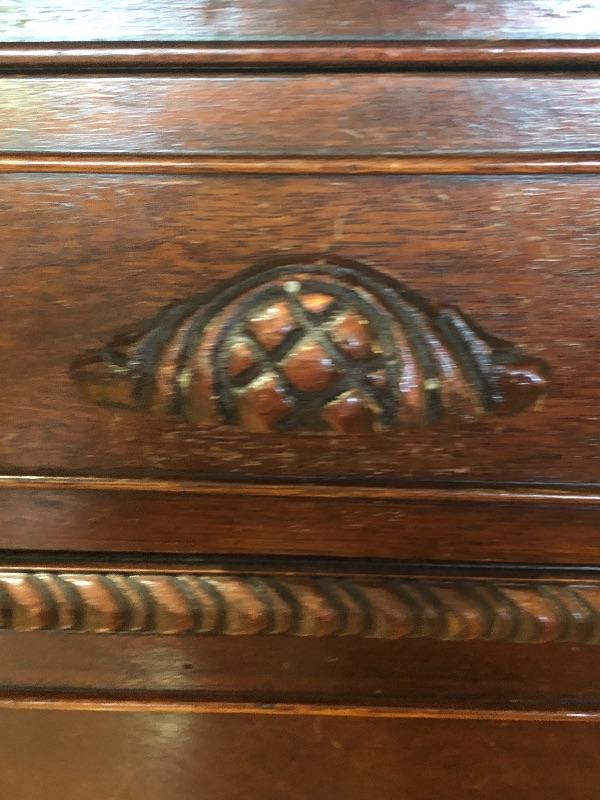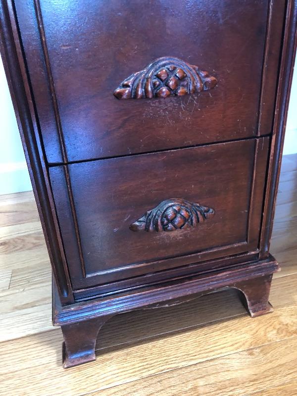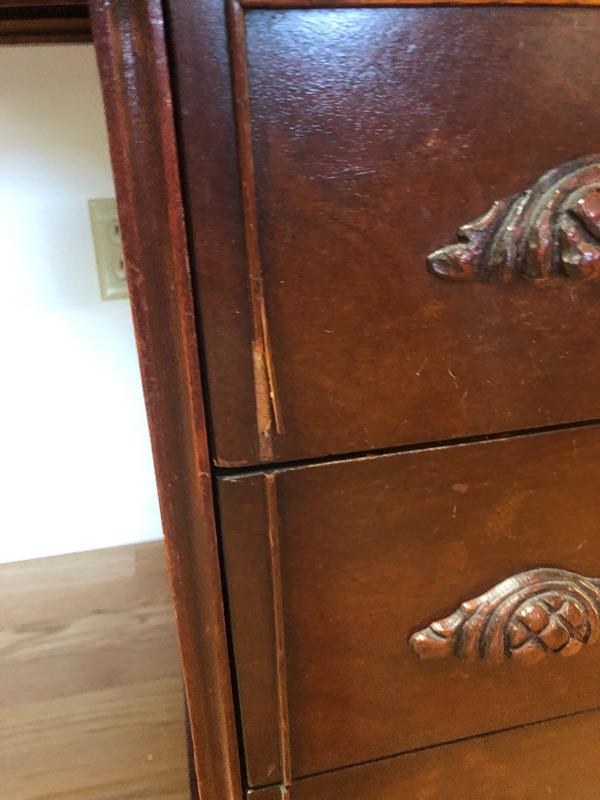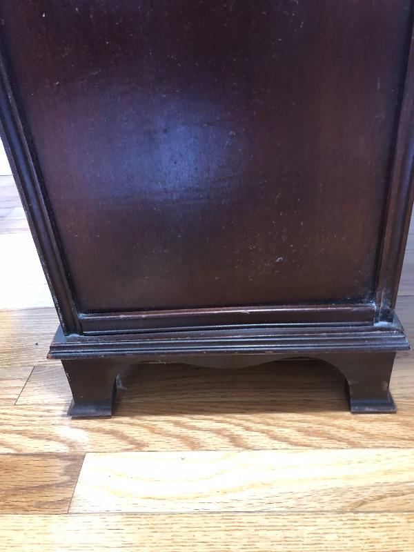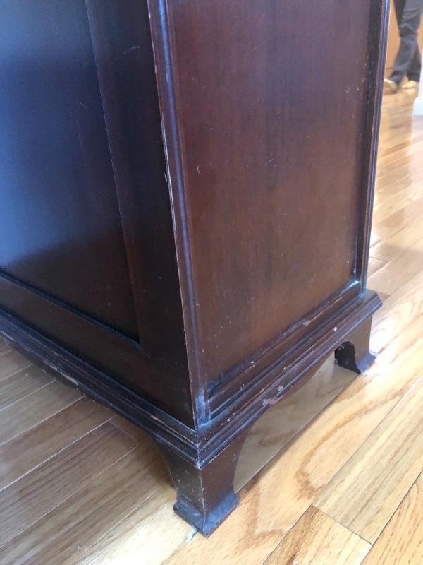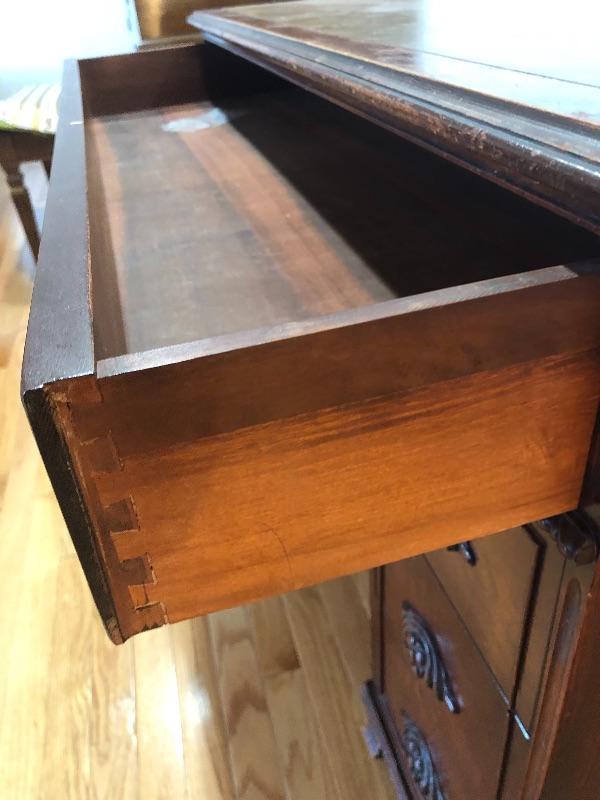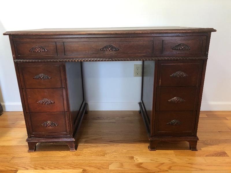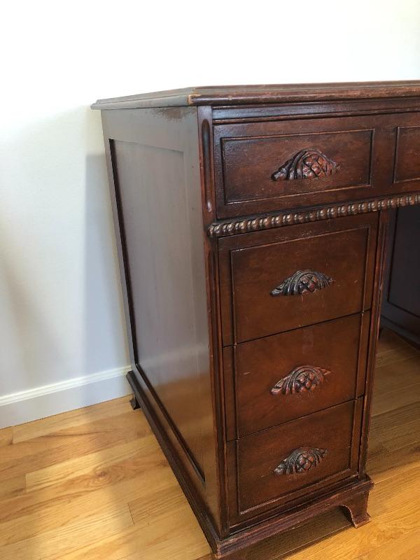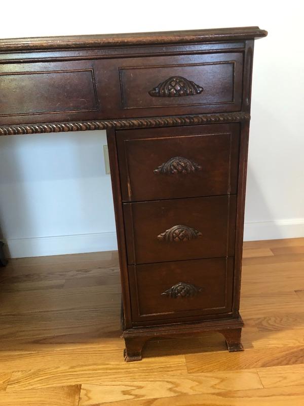 43.5 W x 30 Tall x 23 D, This desk has a leather top with solid wood body. Dove tail drawers. Leather has some wear but gives the desk character. Small scratches on body. Manufacturer not found.