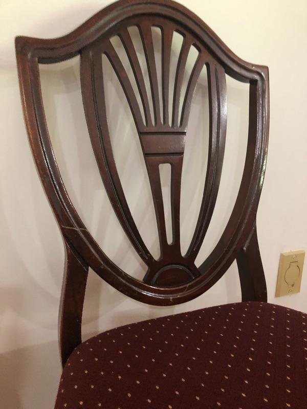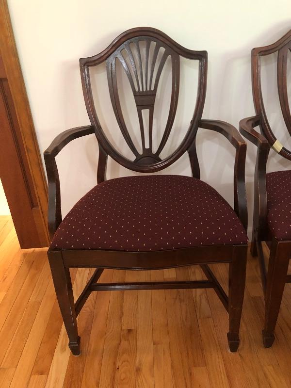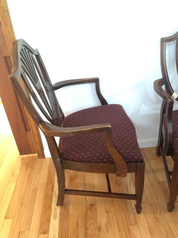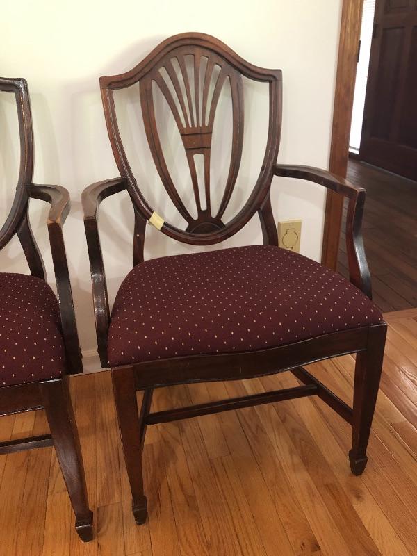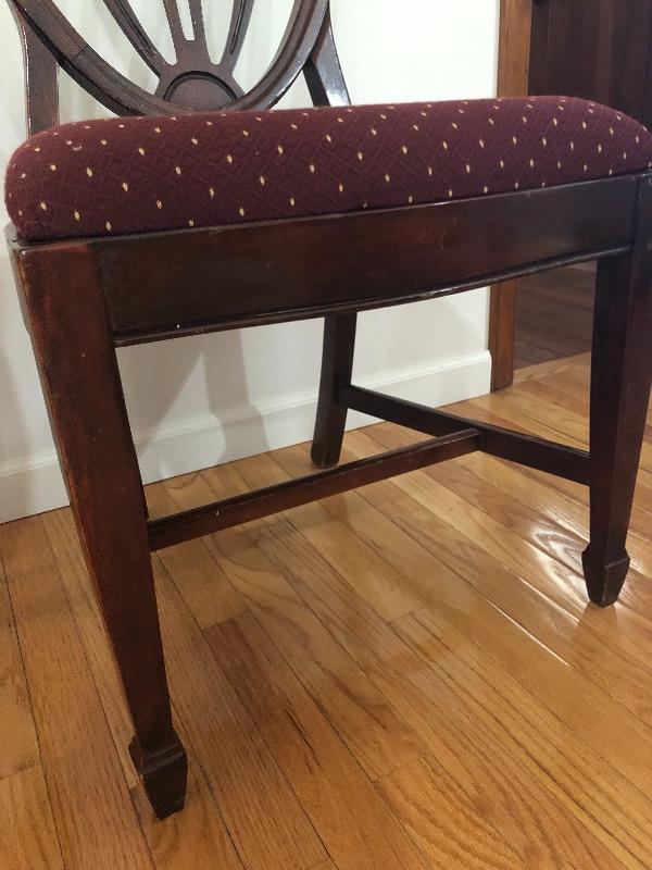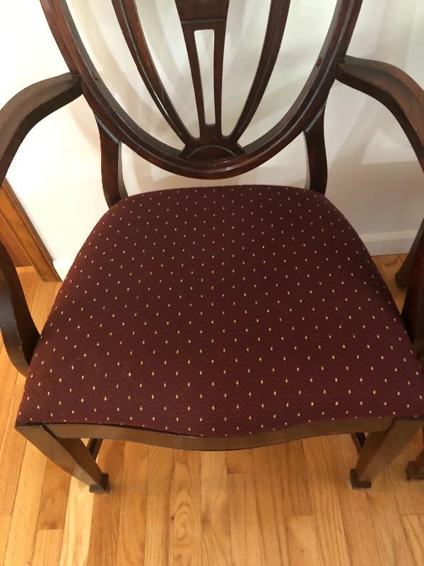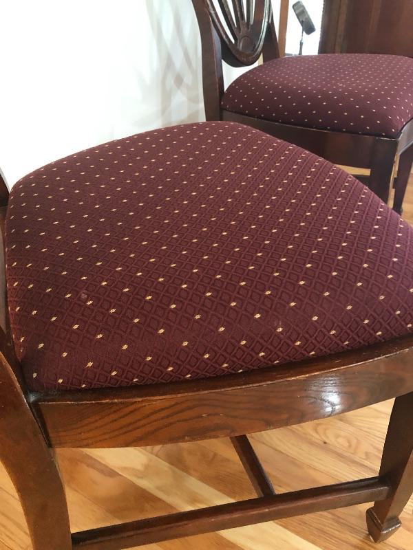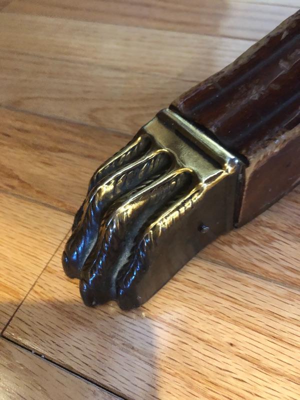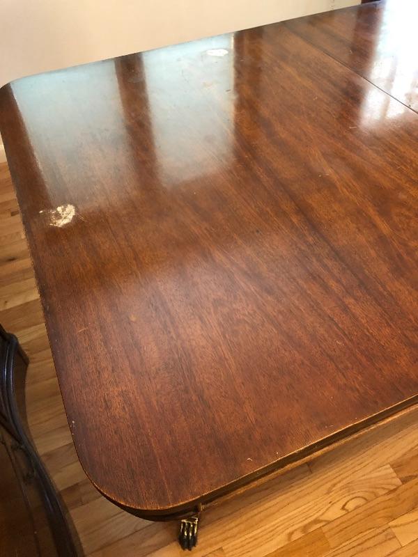 Fabric is Burgundy. Table top needs refinishing, table pad included. One captain chair needs repair. Brass clawfoot, manufacturer not found.