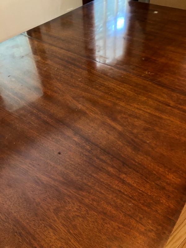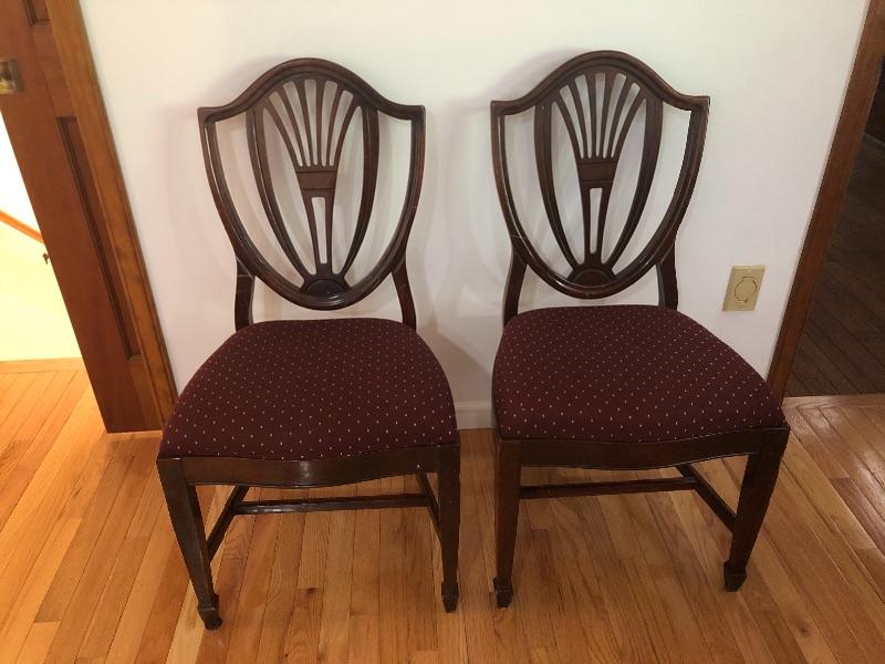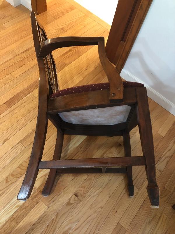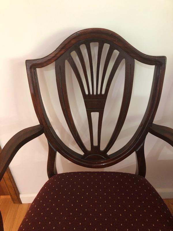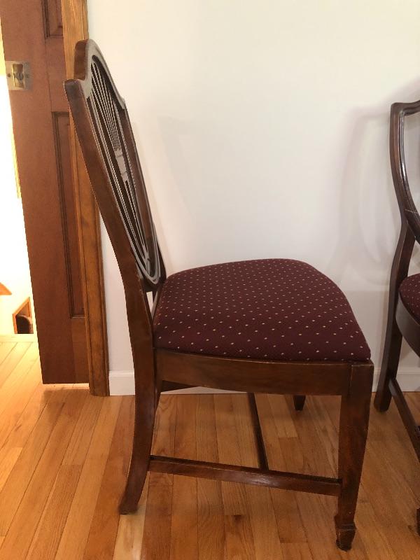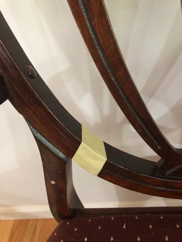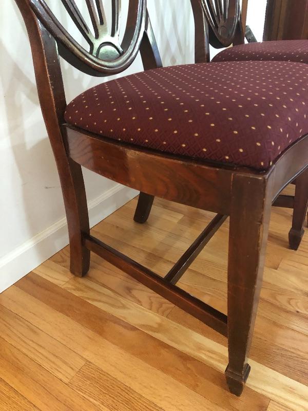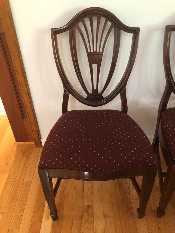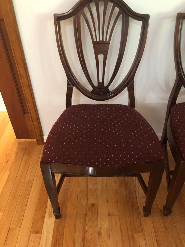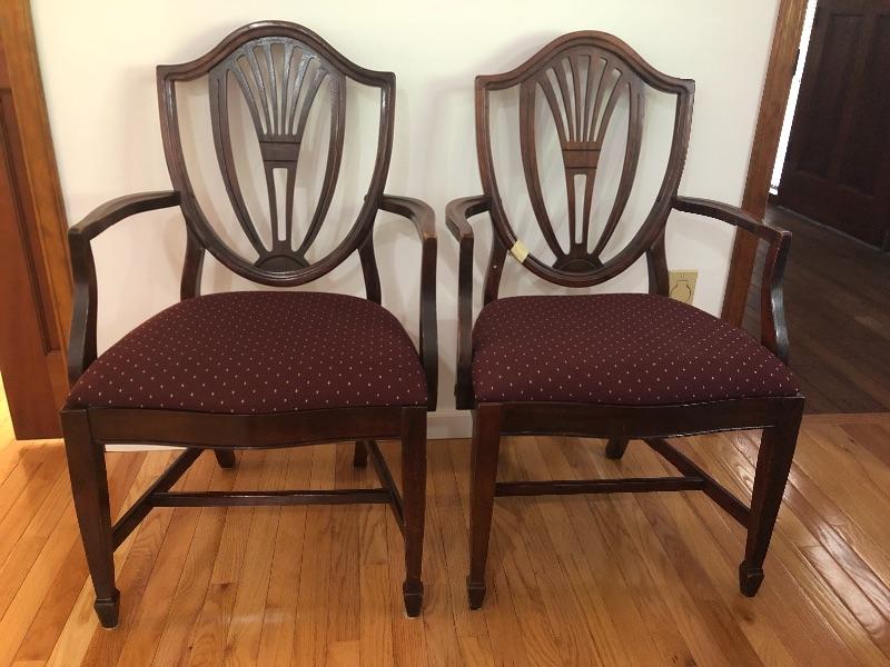 Fabric is Burgundy. Table top needs refinishing, table pad included. One captain chair needs repair. Brass clawfoot, manufacturer not found.