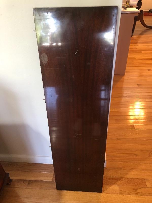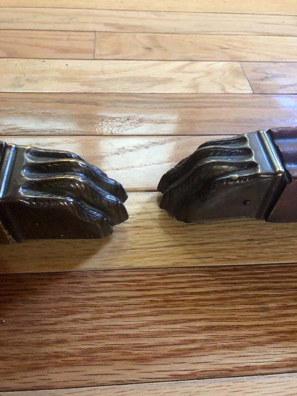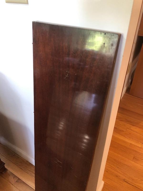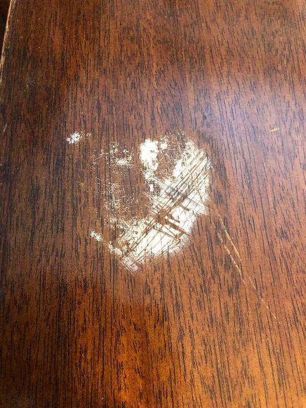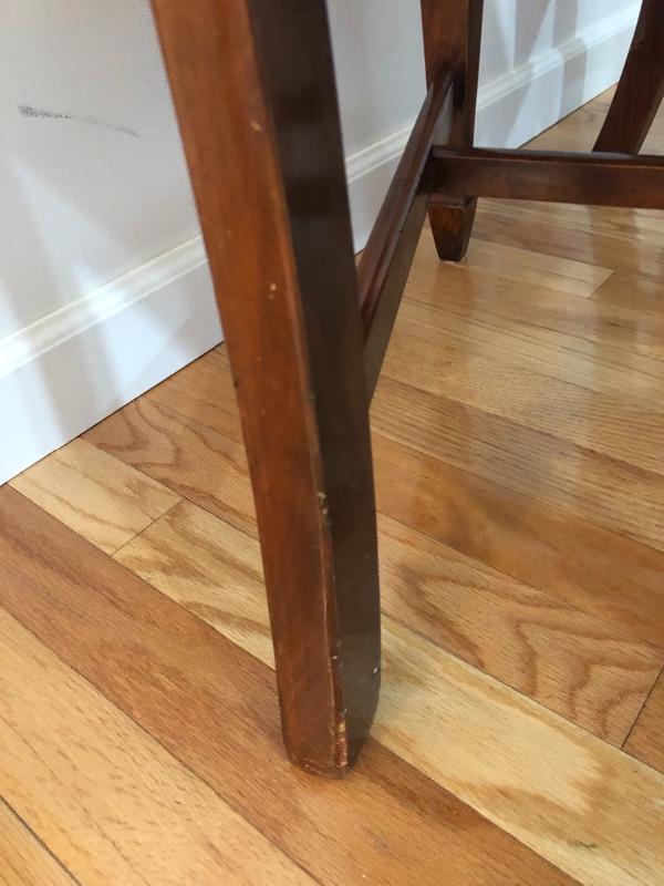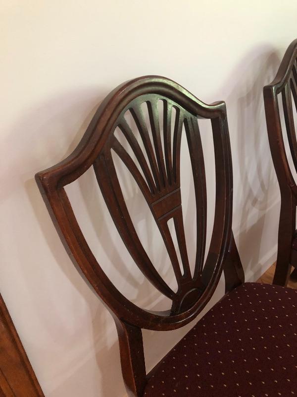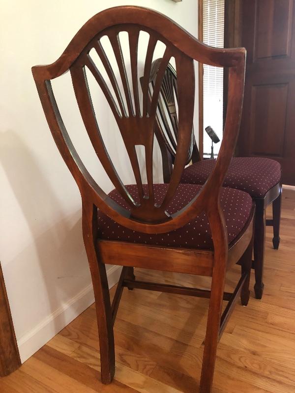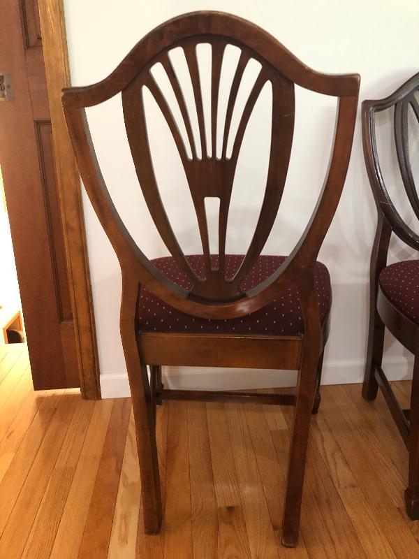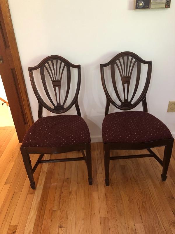 Fabric is Burgundy. Table top needs refinishing, table pad included. One captain chair needs repair. Brass clawfoot, manufacturer not found.
