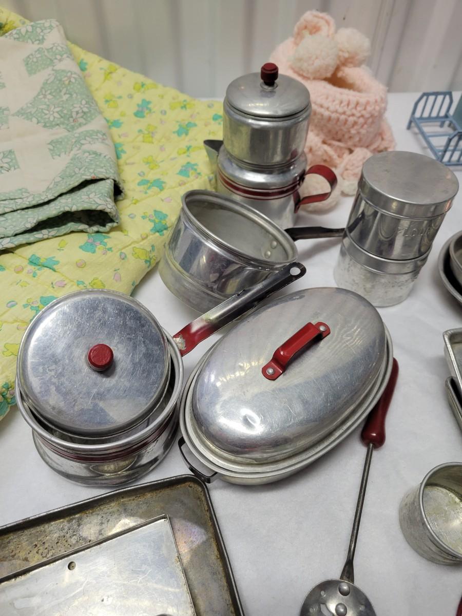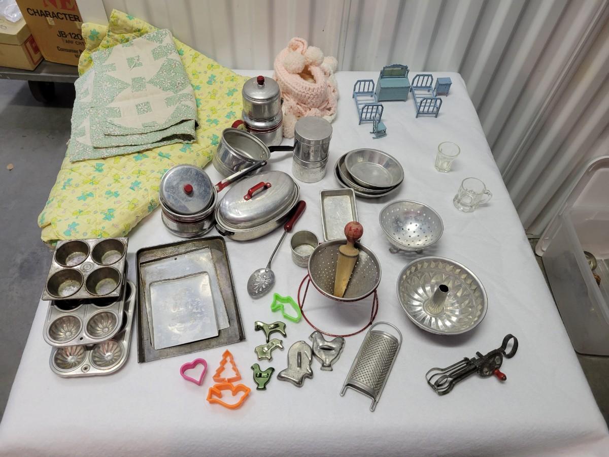 Vintage Bakeware, Doll House Furniture & Table Cloths