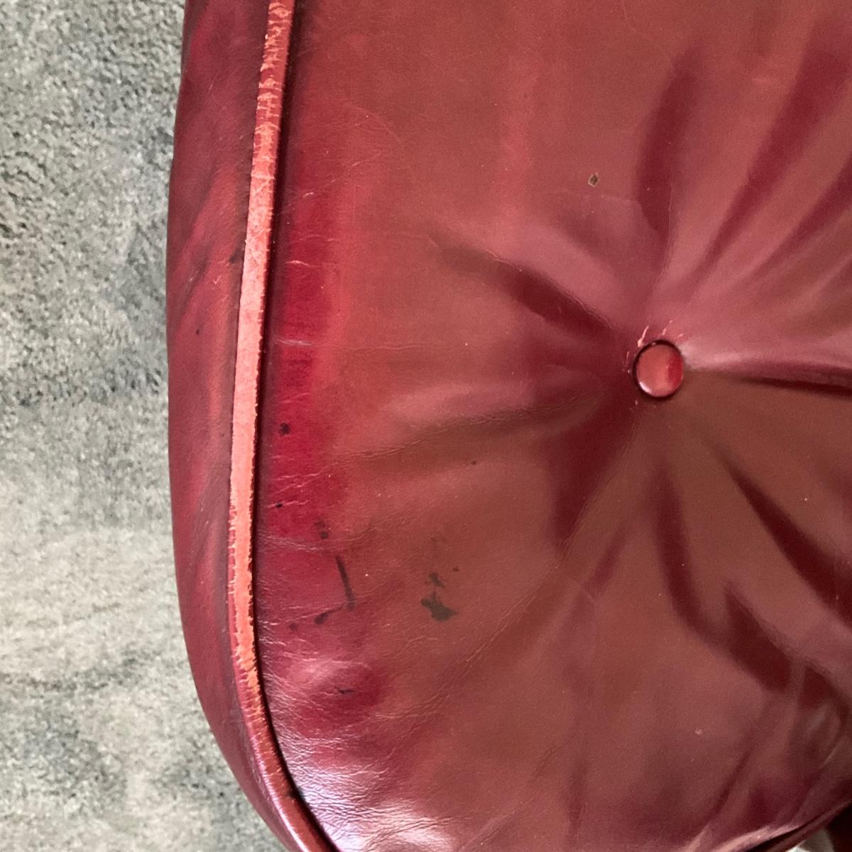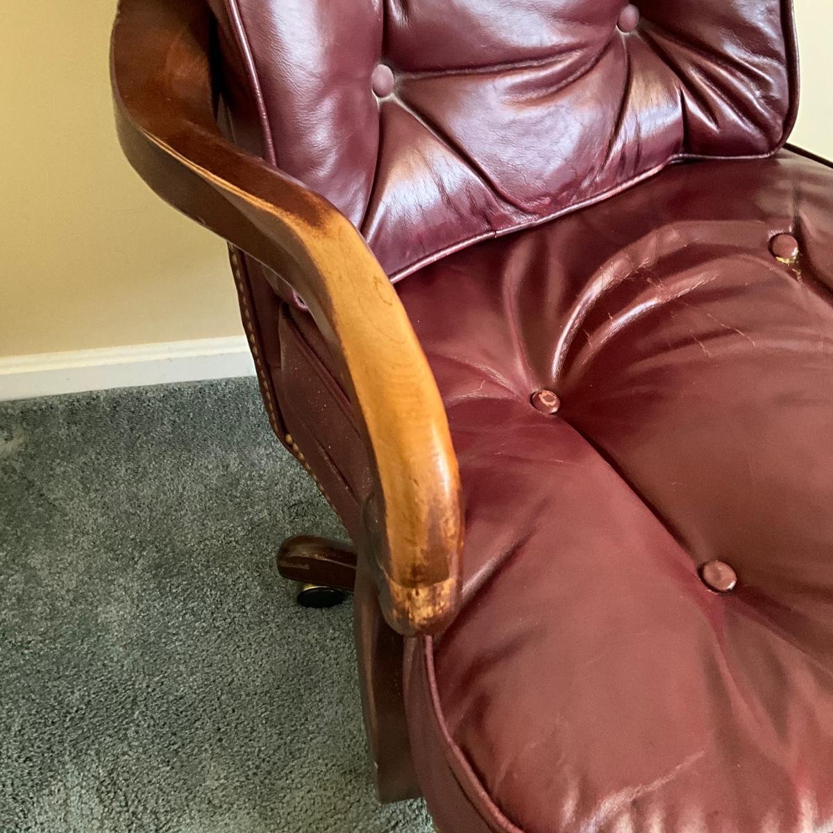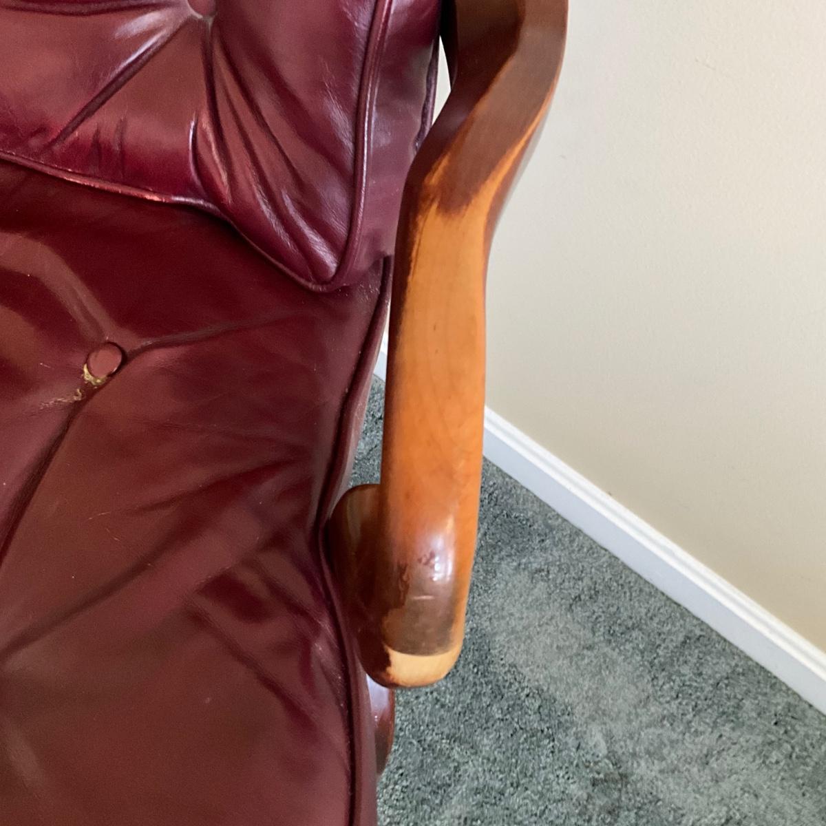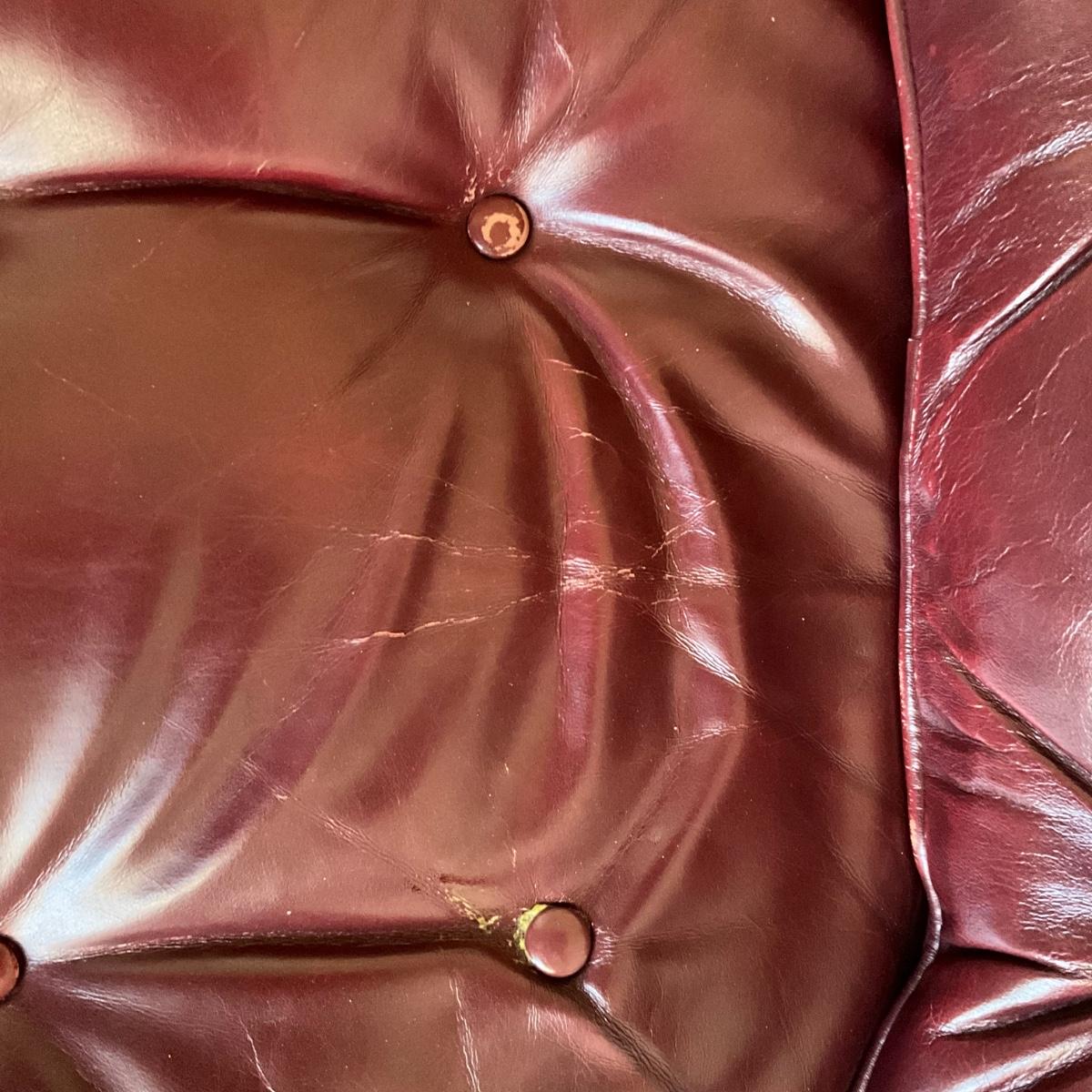 Tufted back with signs of wear on arms and around button on seat