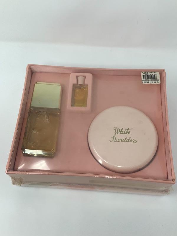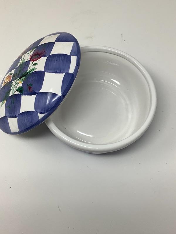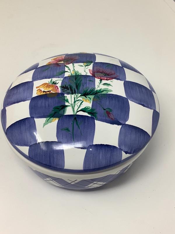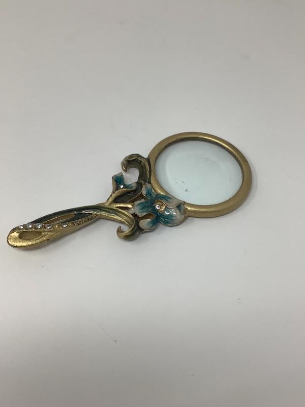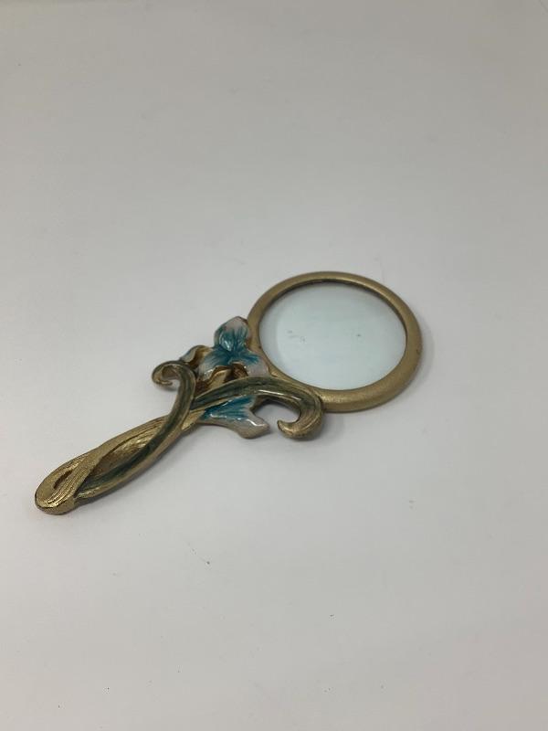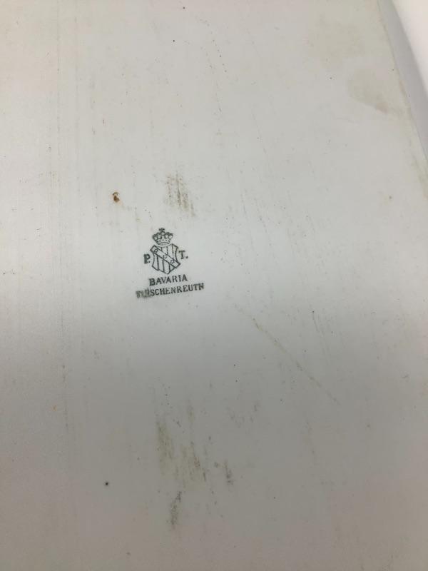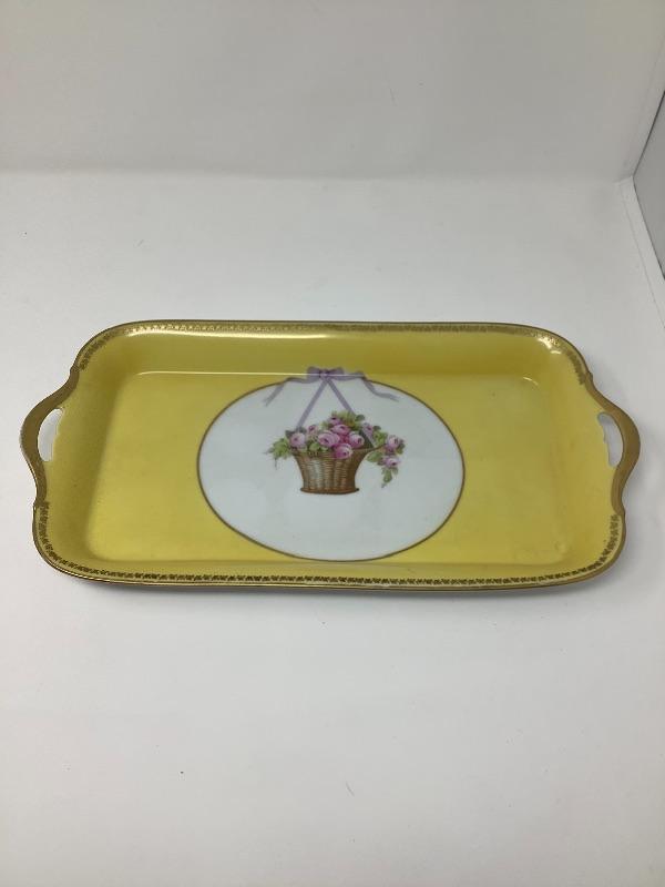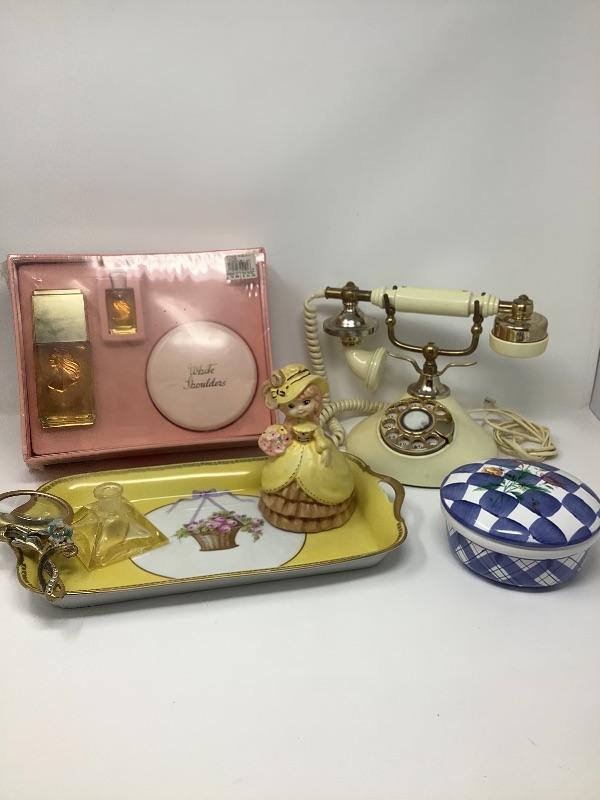 Yellow and Blue Bavarian Porcelain Tray 14 inches Long x 7.5 Deep, vintage phone, unopened White Shoulders perfume set, blue ceramic container, antique hand held magnify glass