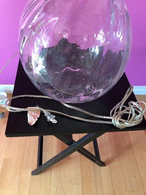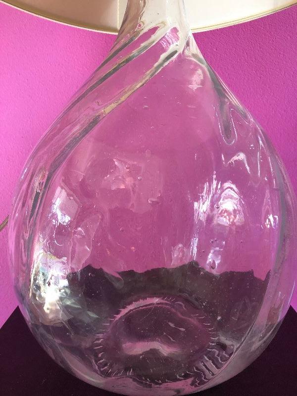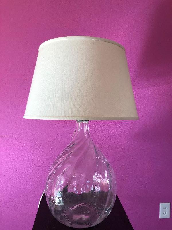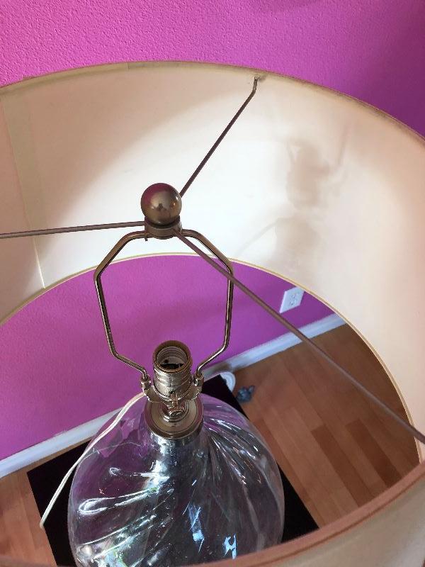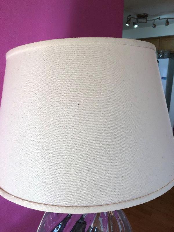 Large clear glass table lamp with shade. This is a very heavy lamp and quite striking. It measures 31"H x 12" Radius, shade is 19" Radius.