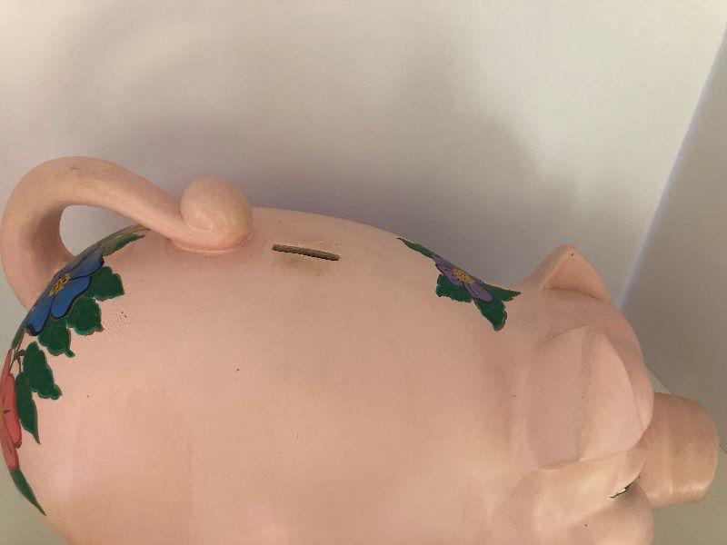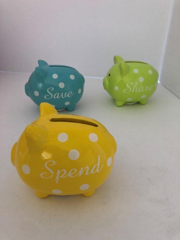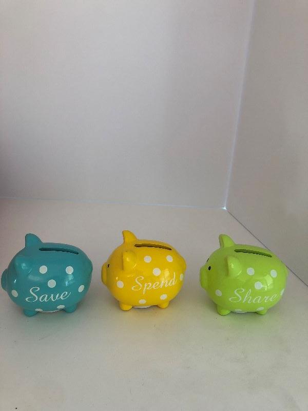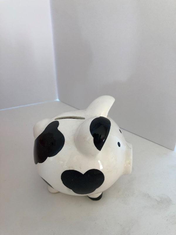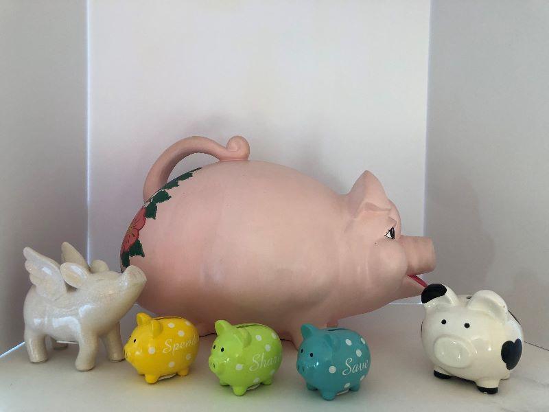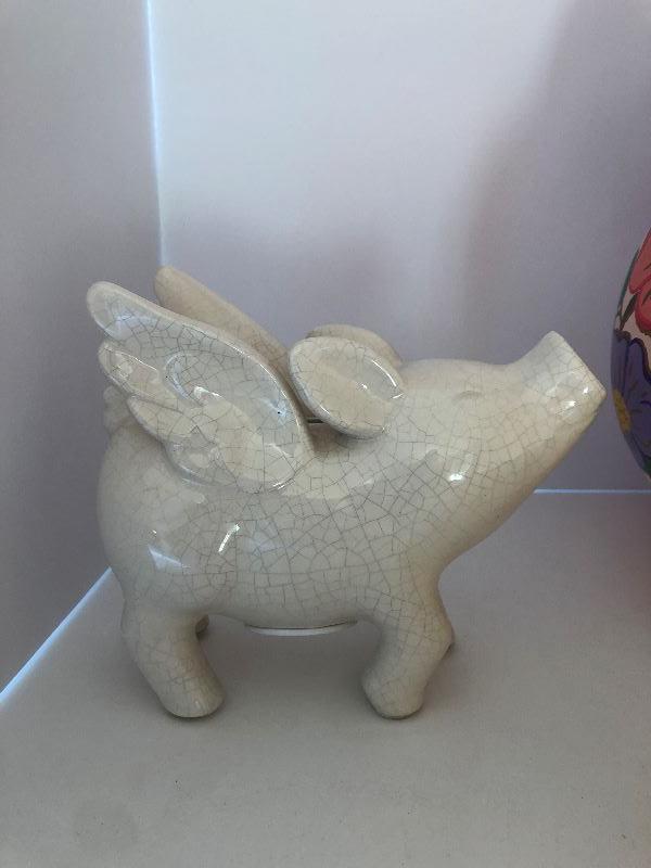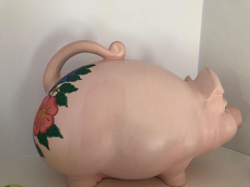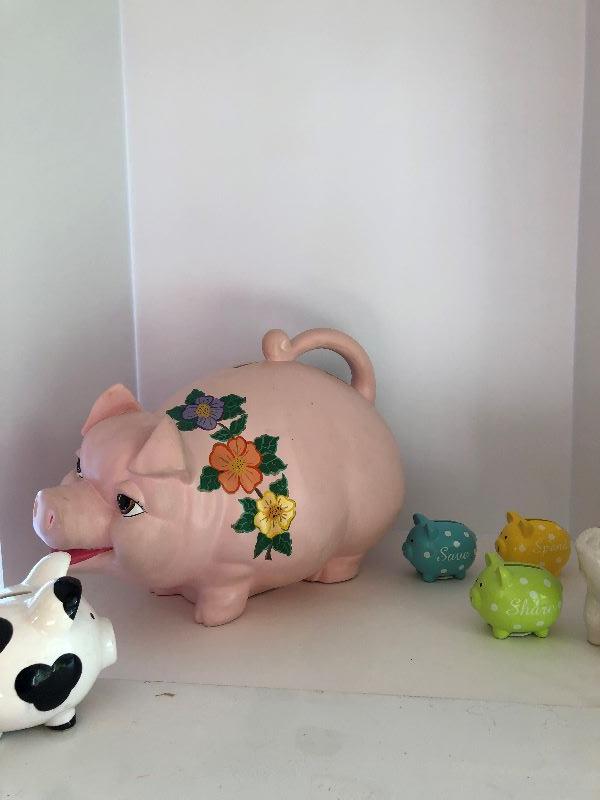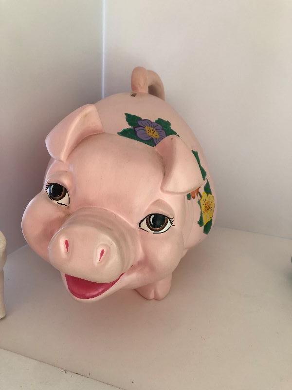 Cute collection of 6 whimsical piggy banks. The largest piggy measures 17"L x 12"H