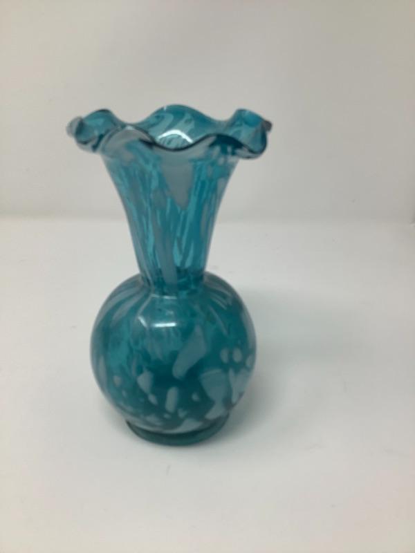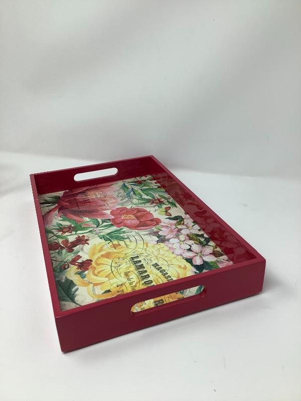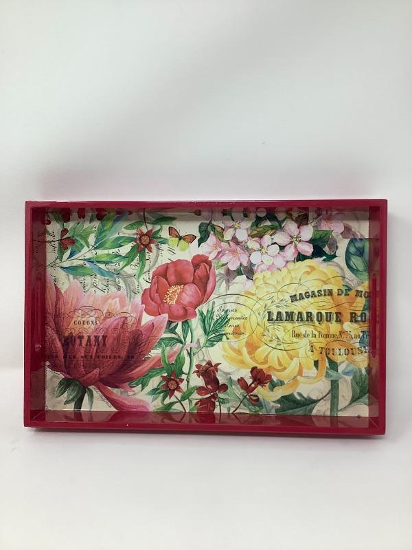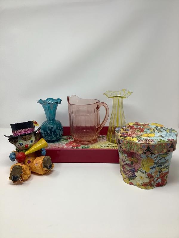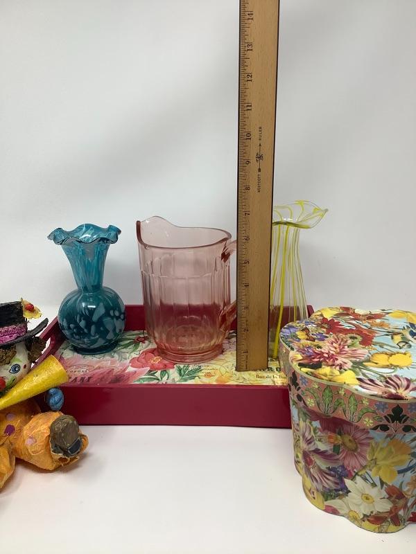 Vintage Rose Glass Pitcher, Floral Wood Tray, Two Vintage Flower Vases, Box and other items.