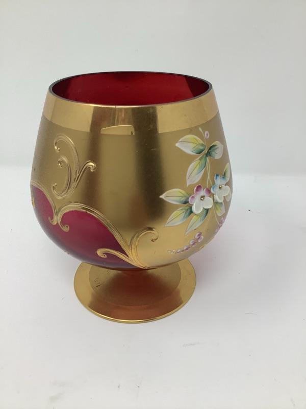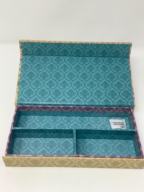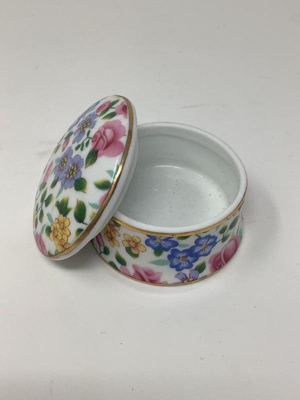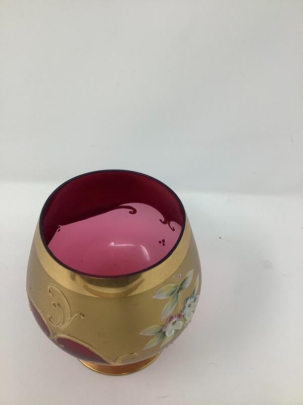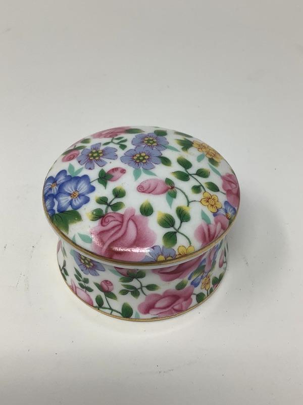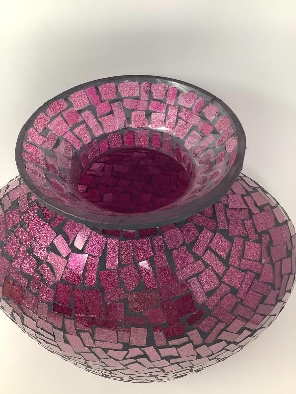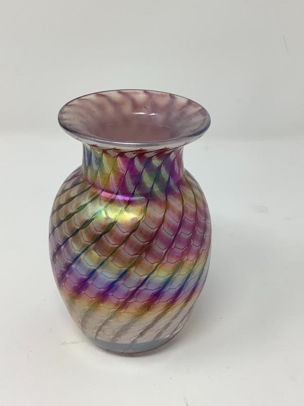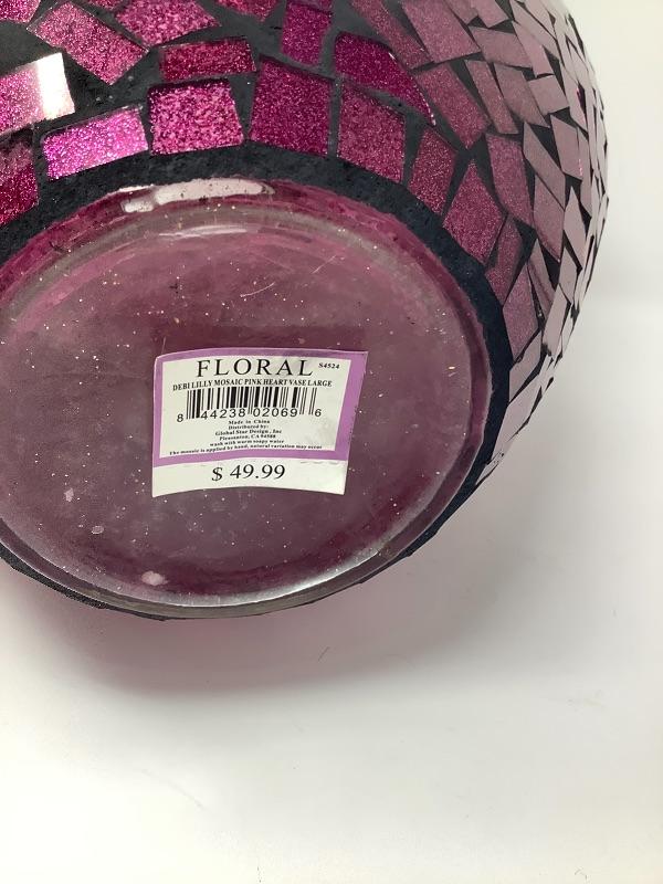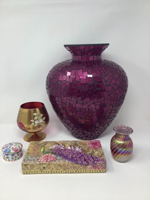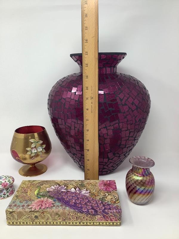 Pretty In Pink and Purple vases and box. Lot includes a hand blown glass vase signed by the artist, and a vintage hand painted glass. Large vase still has the original price tag of 49.99 and a small porcelain jar.