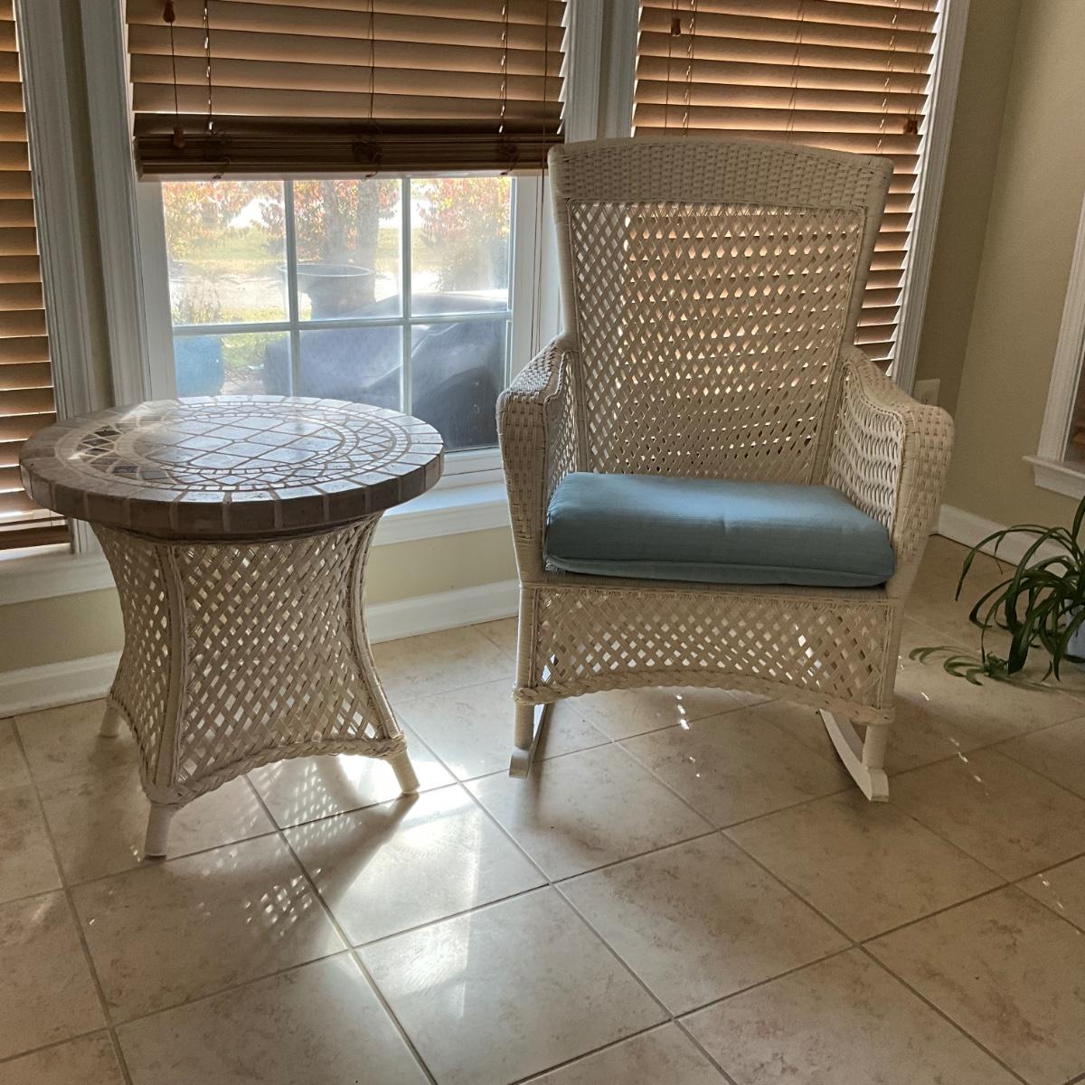 016 Like New Lloyd Flanders Grand Traverse Wicker Mosaic Travertine Table and Rocking Chair