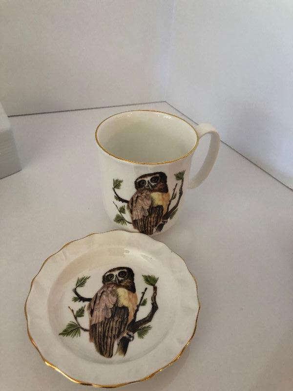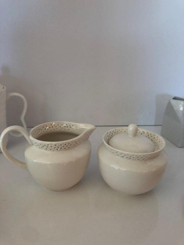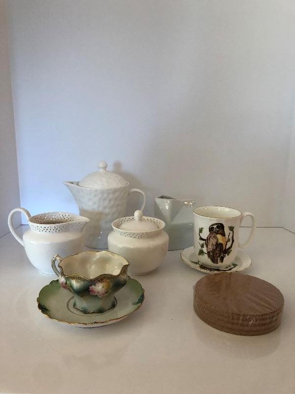 Assorted Teacups, saucers, teapot, creamer, and coaster set.