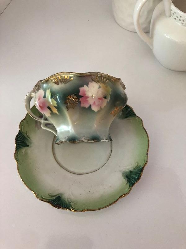 022: Assorted Teacups, Tea Pot, and Coaster Set