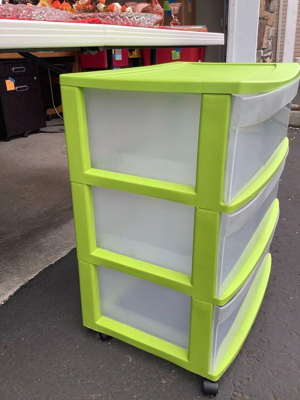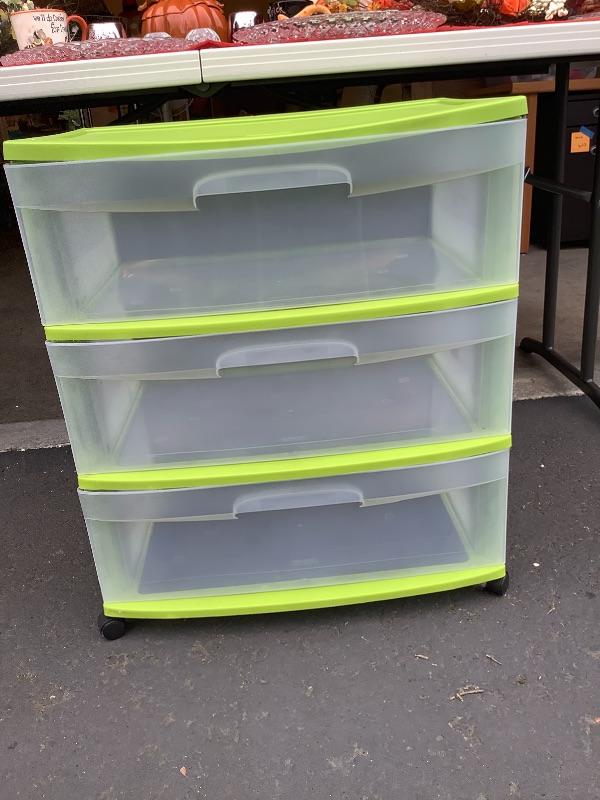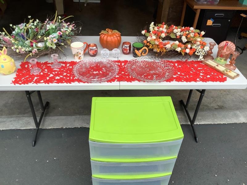 Thanksgiving and Halloween Decor and 3 drawer plastic storage