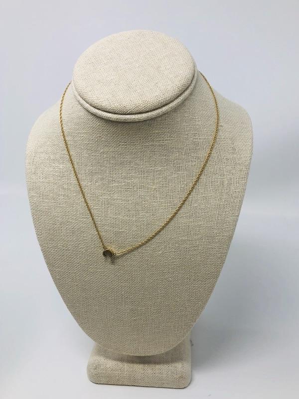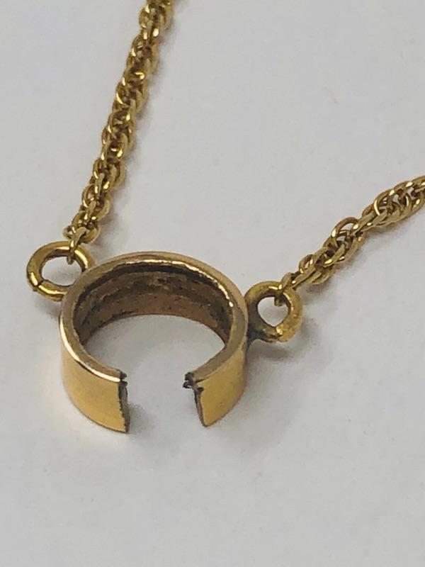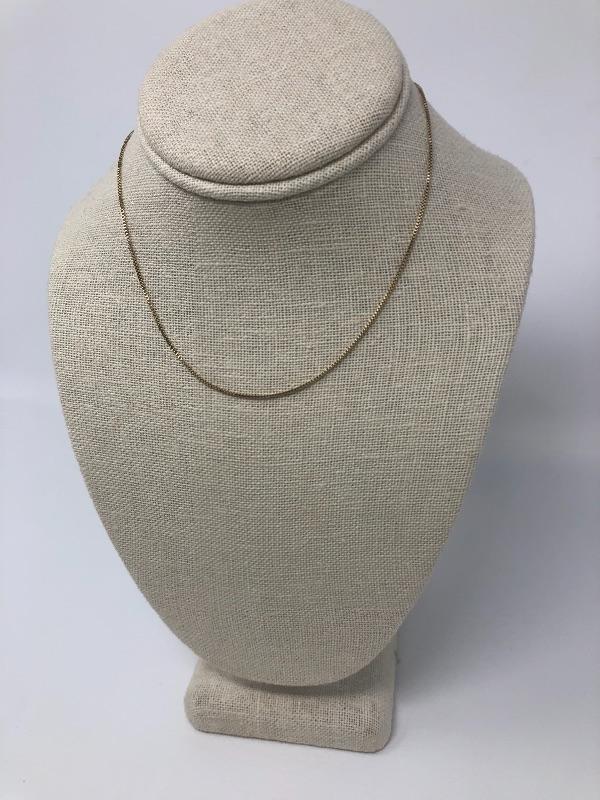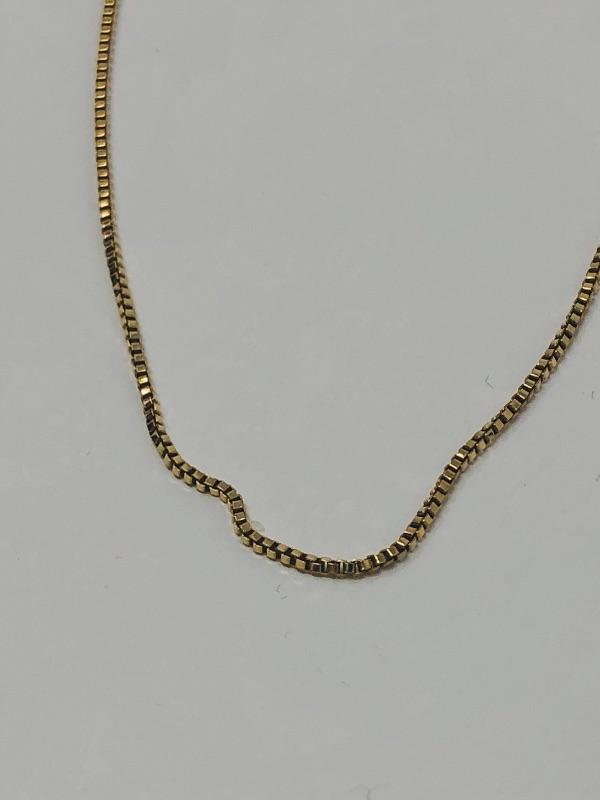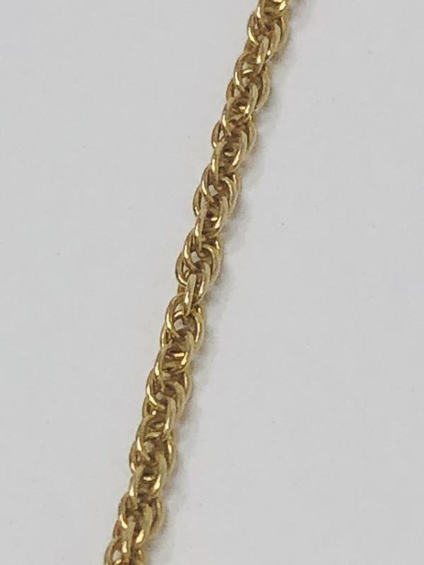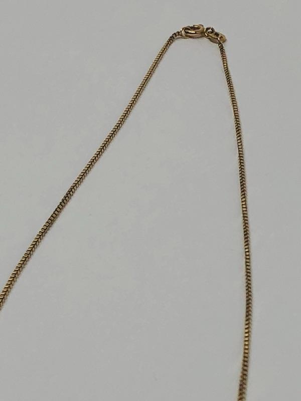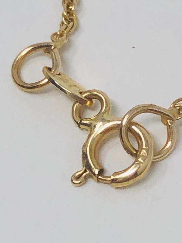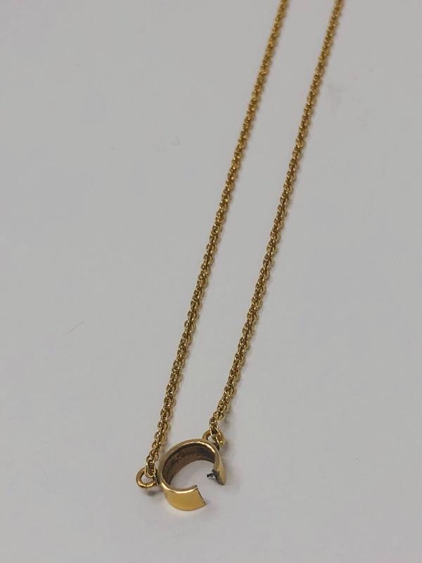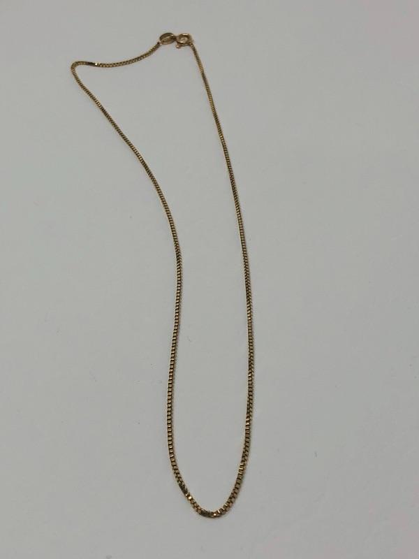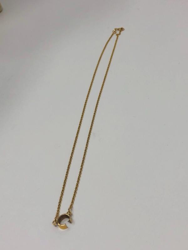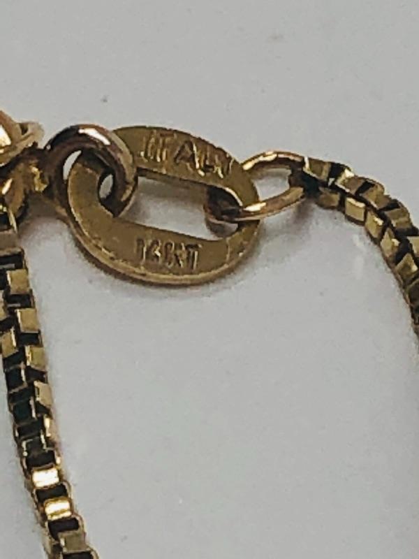 16 inches, with pendant 1 gram. Please note the pendant on the necklace is broken. It appeared to be a circle and now it's a C shape. I did not see any markings to indicate it was also 14 K gold However, this could have been on the broken piece.