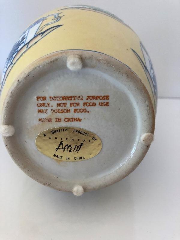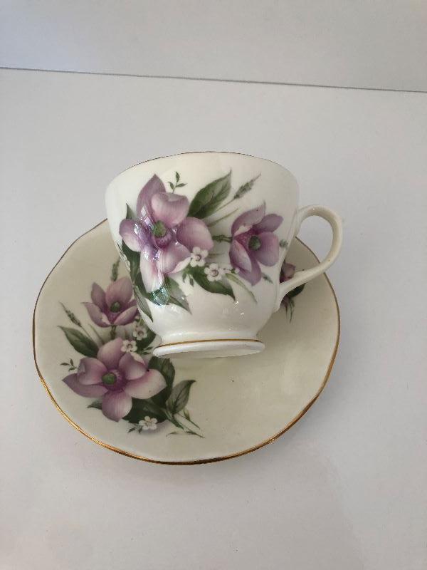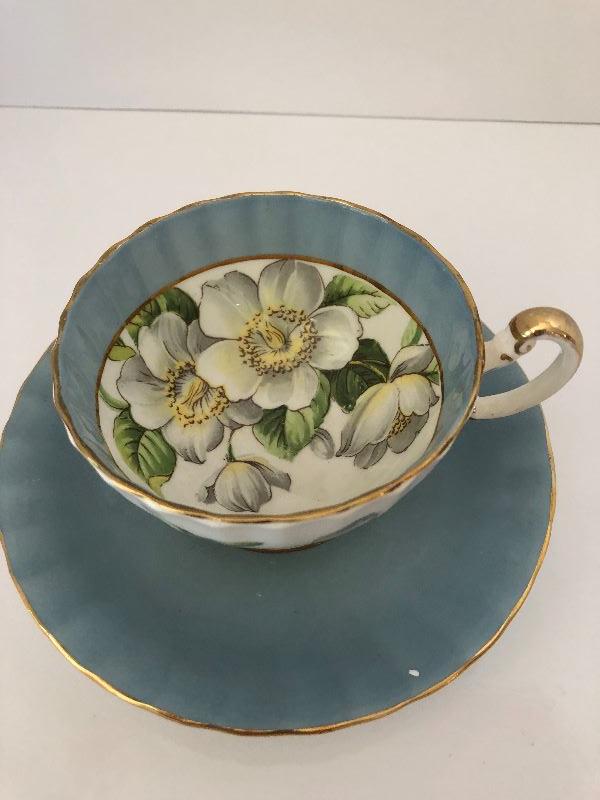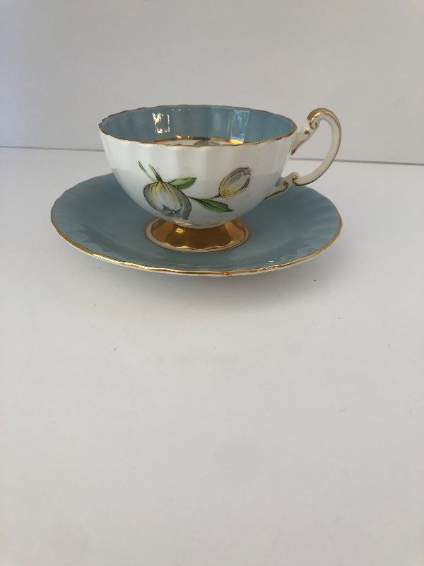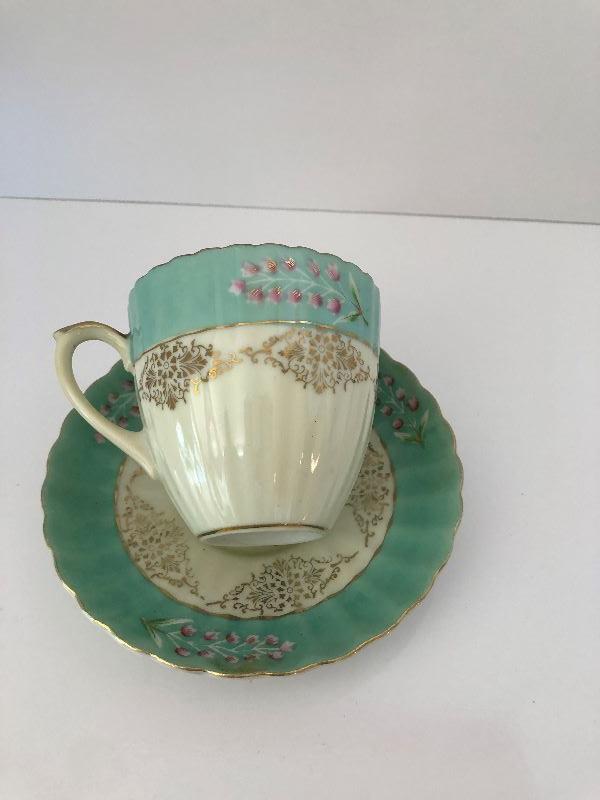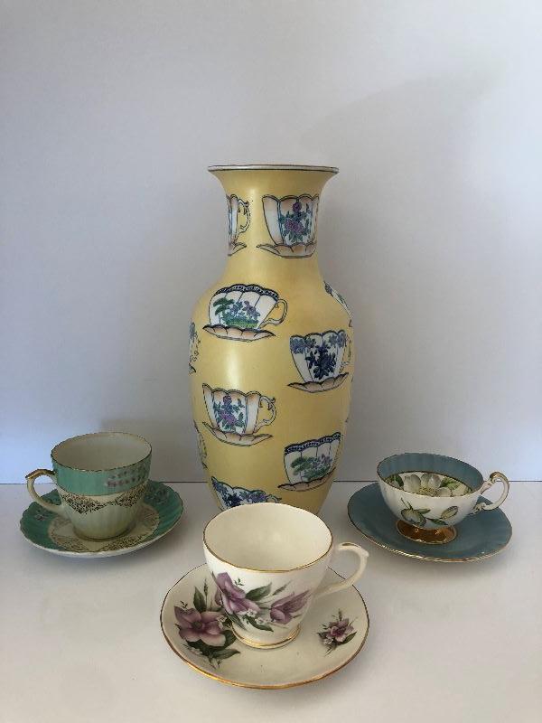 Three tea cup and saucer sets and a beautiful vase with tea cup pattern measuring 13"H