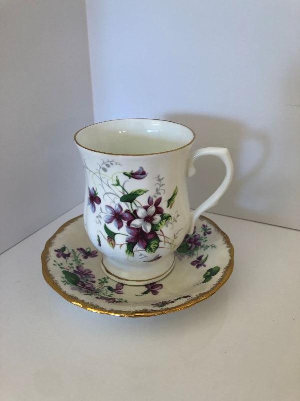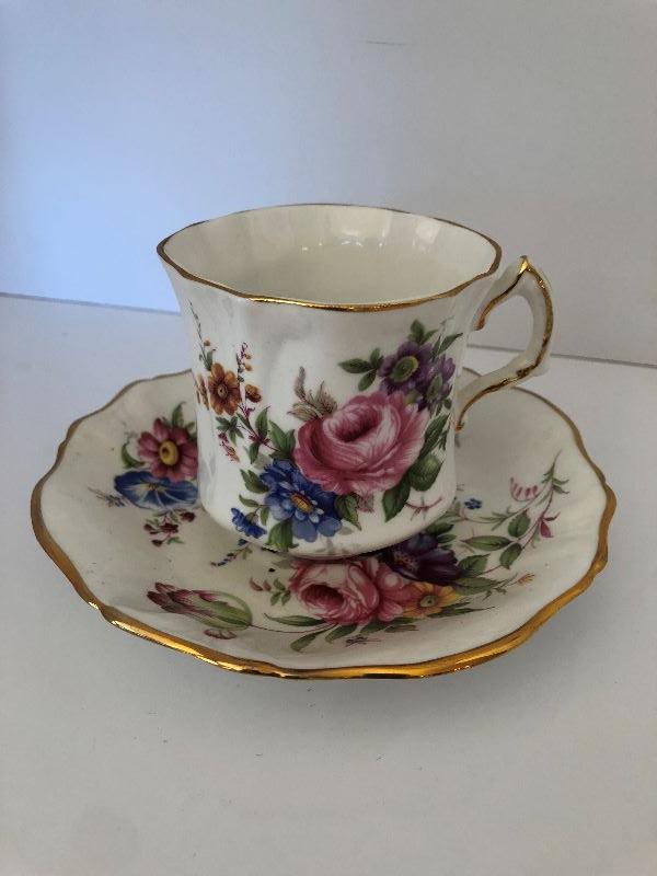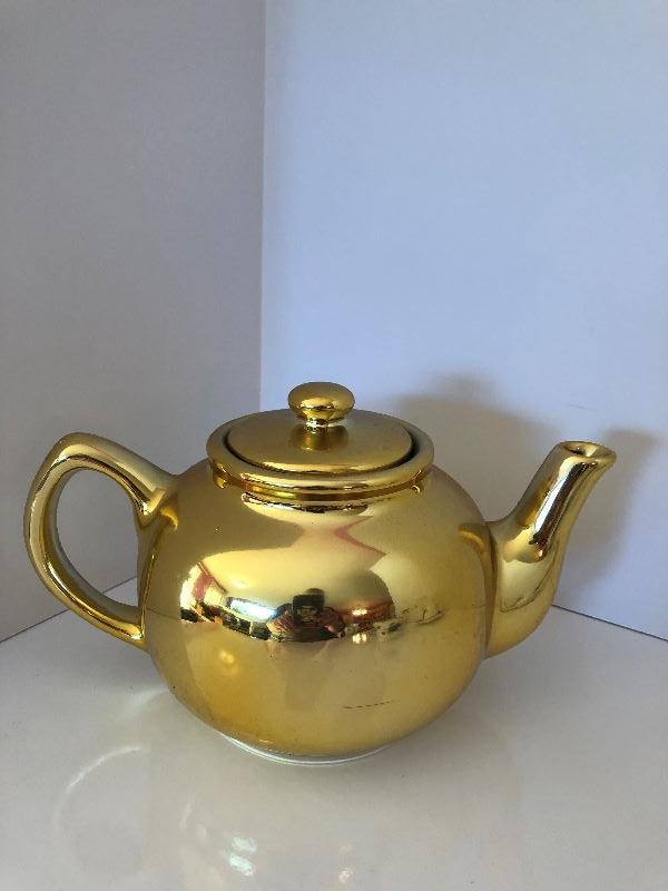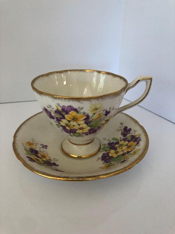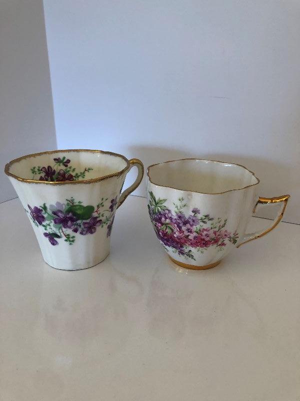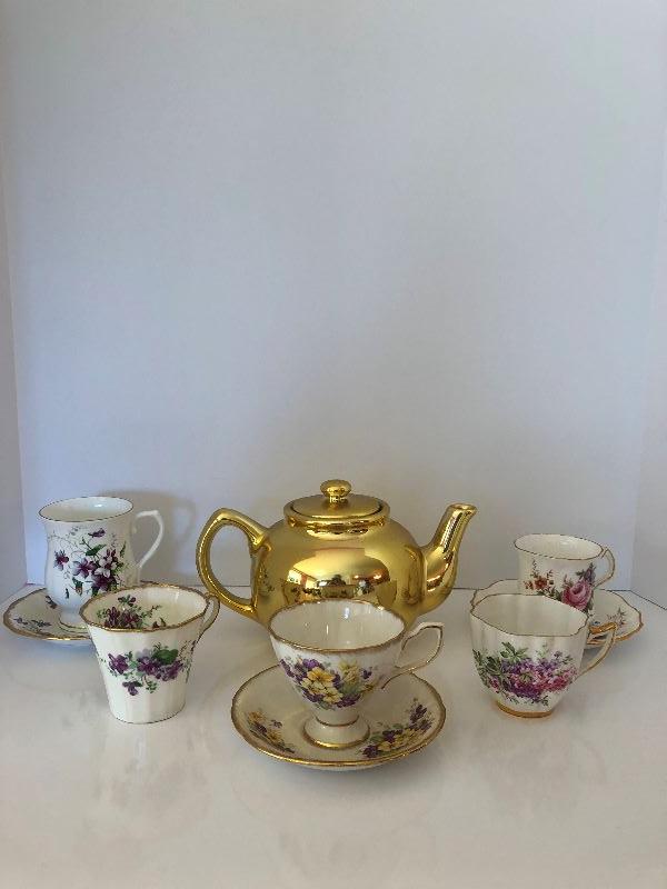 These 5 tea cups and tea pot are not a set, but they oddly match in a shabby cheek style.