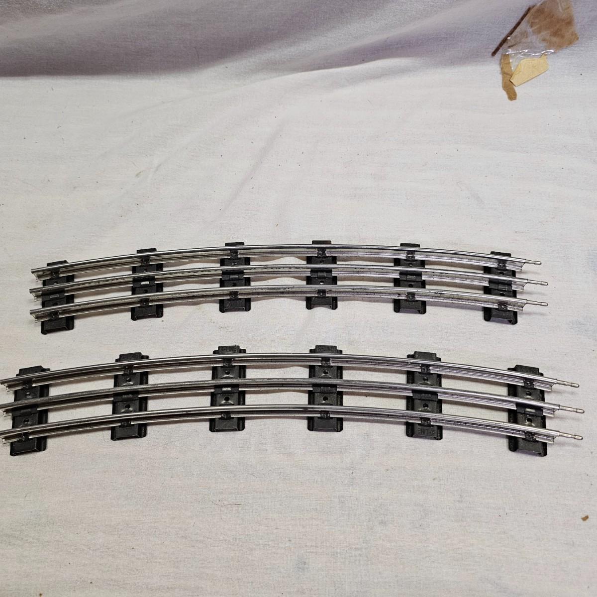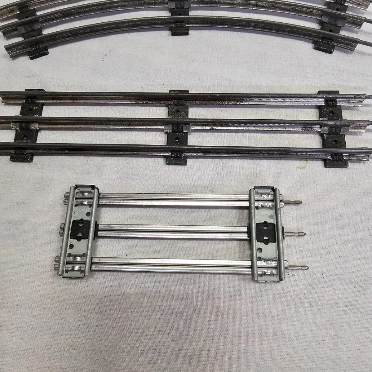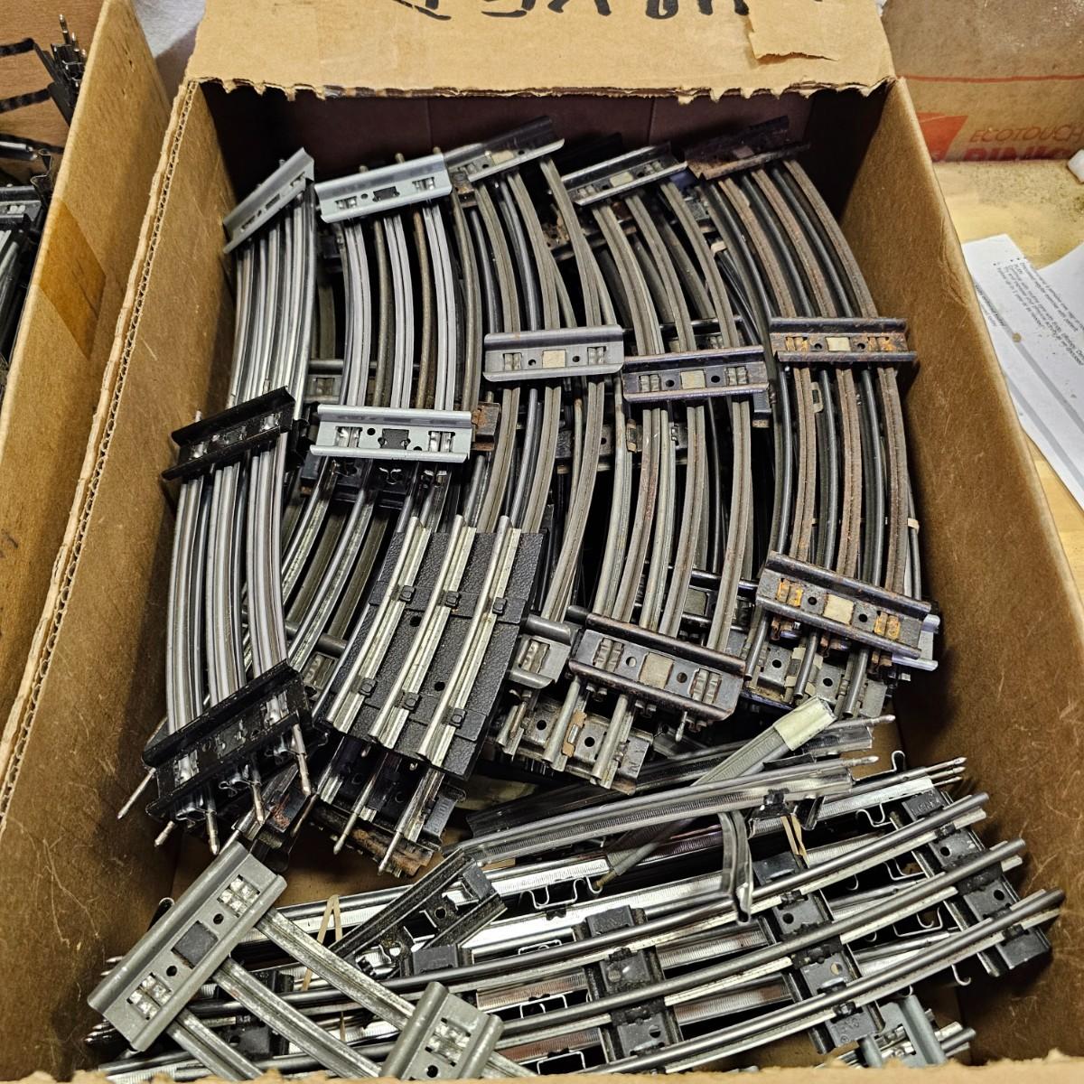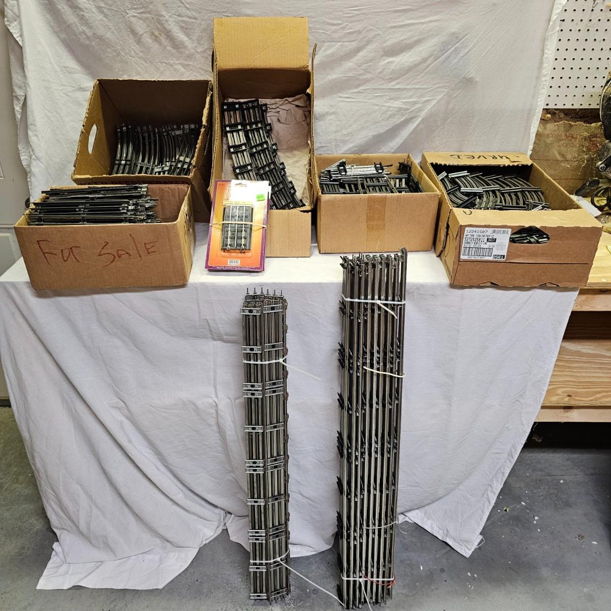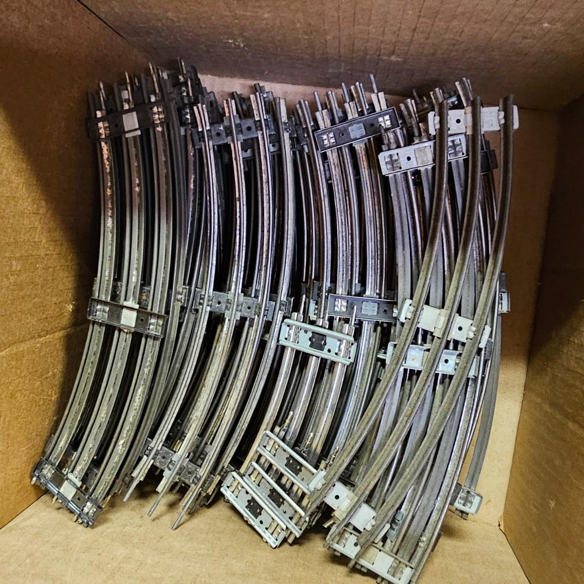 Multiple pieces of O and 027 gauge sectional track, as well as some 32" and 40" straight pieces. There are small straight and curved sections for both sizes, hard to guess quantity. There are also some larger 15" curves by K-Line and some small fill in pieces as well. Guesstimate over 200 pieces of sectional track, and twelve 40" straight and fifteen 32" straight. All track is used, some more than others. Most have pins in. See photos for details. Local pickup only. Please note that any price tag seen on an item was not put there by Sterling Transitions and does not reflect the current value of the item.