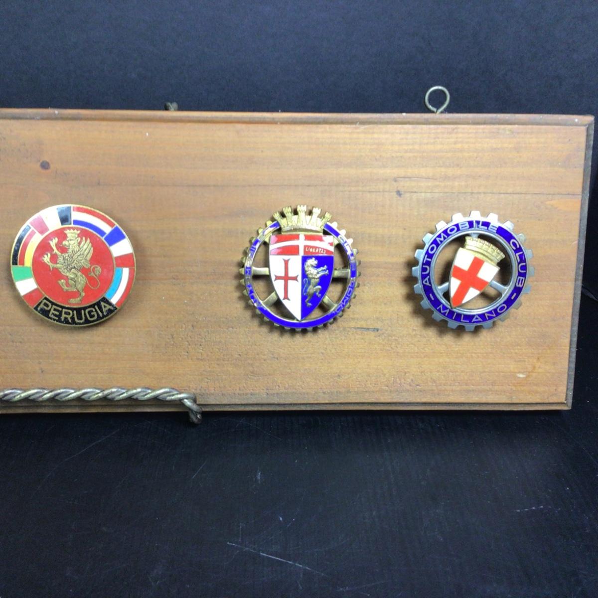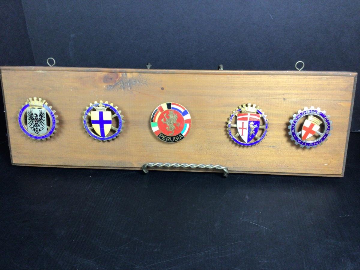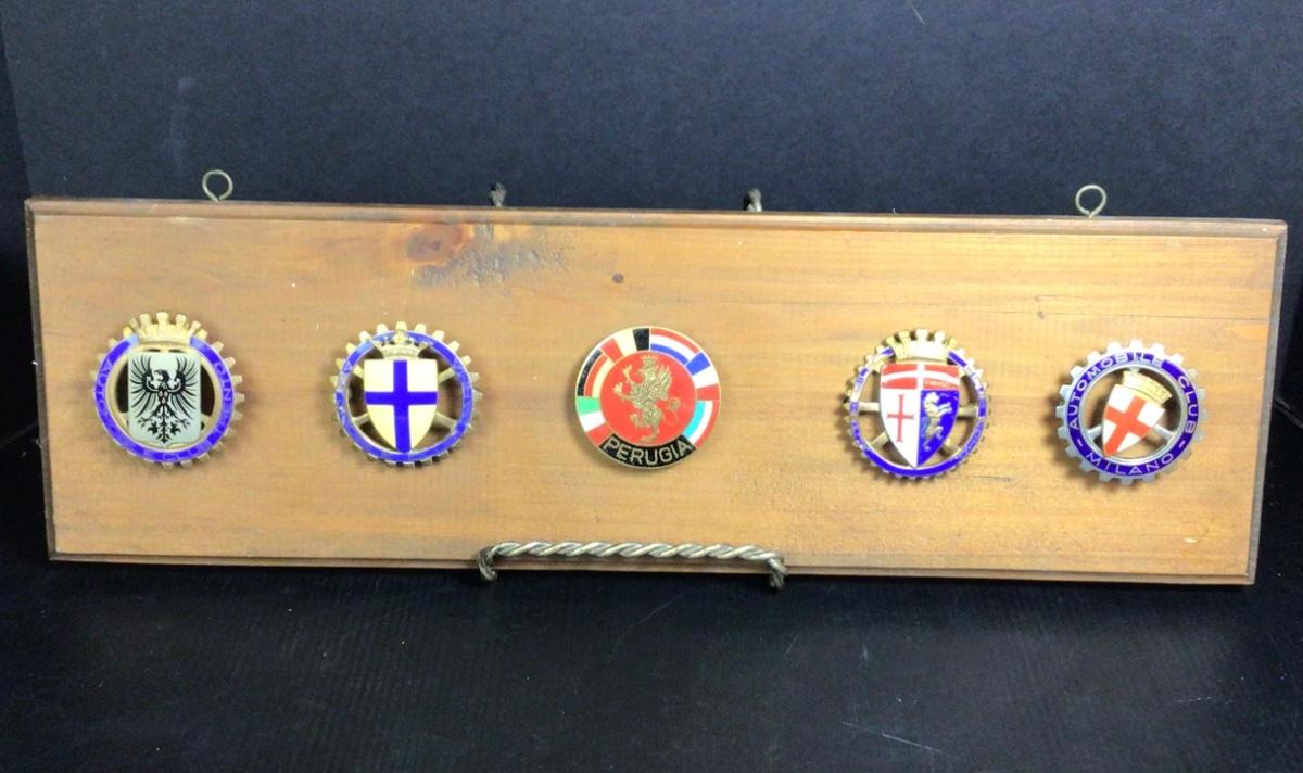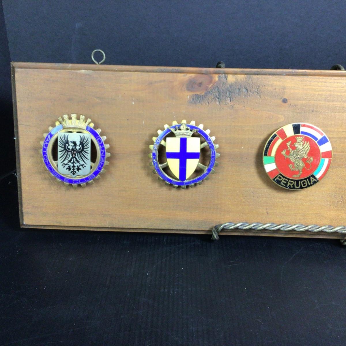 Badges are mounted on wood, ready to hange, measures 20” x 6”. Cities included are Milano, Como, Peruvian, Parma and Trento.