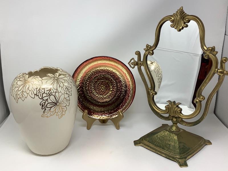 Vanity Mirror, Clar-est Vase signed by the artist, Glass Plate on Plate Stand