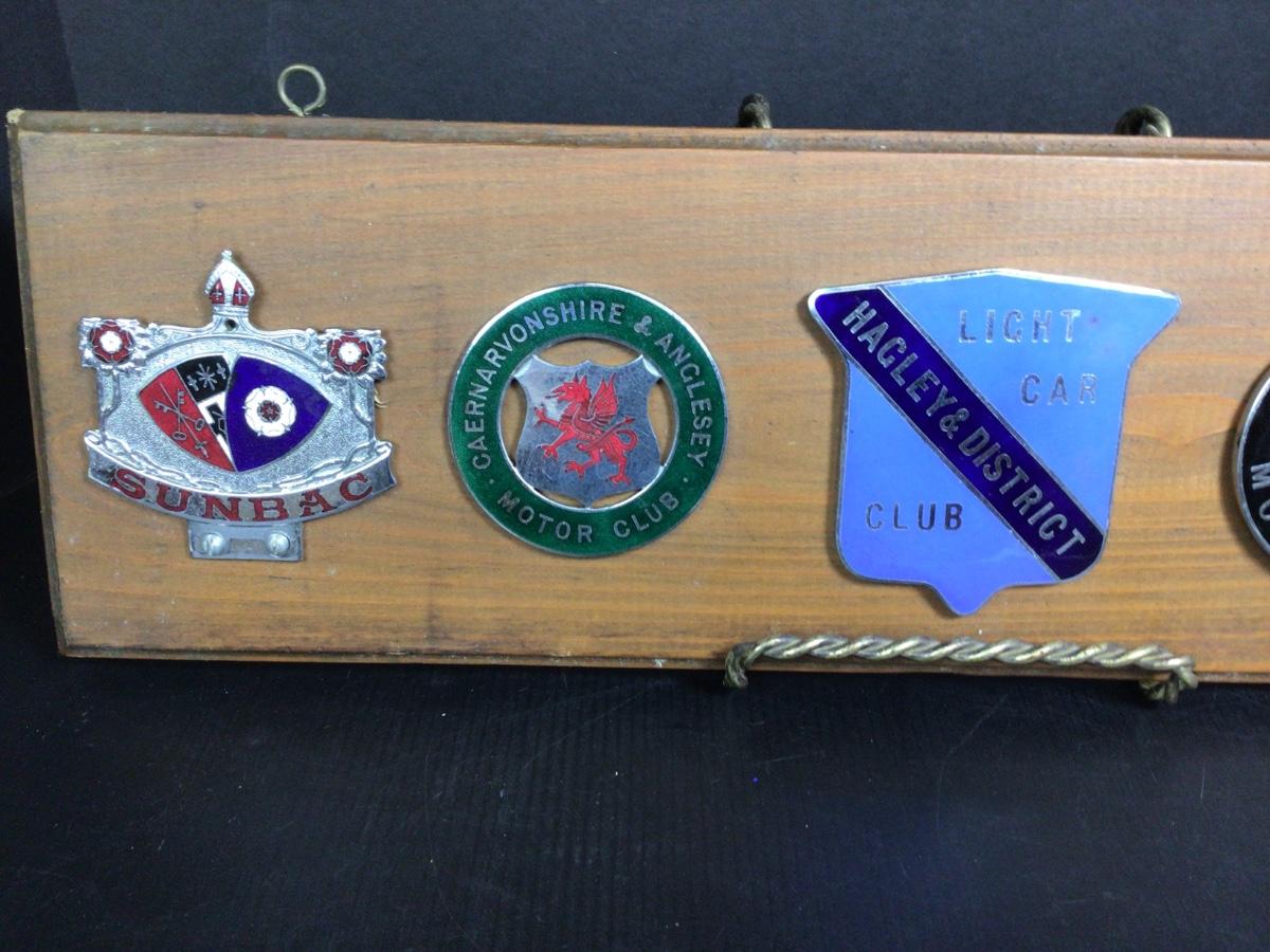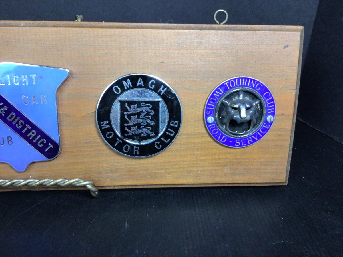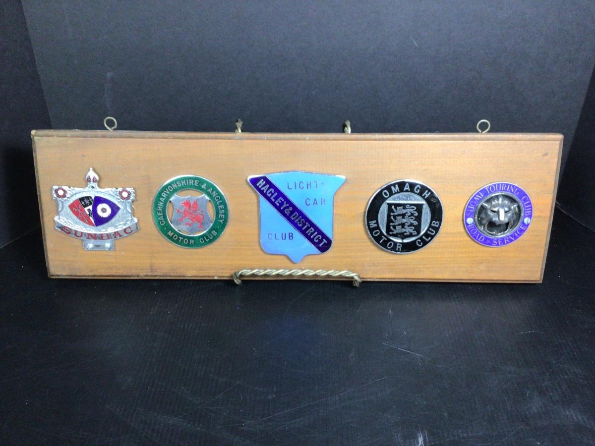 There are 5 badges mounted to wood, ready to hang, measures 20” x 6”. Badges include Sunbac, Caernarvonshire, Harley, Omagh and Suomi.